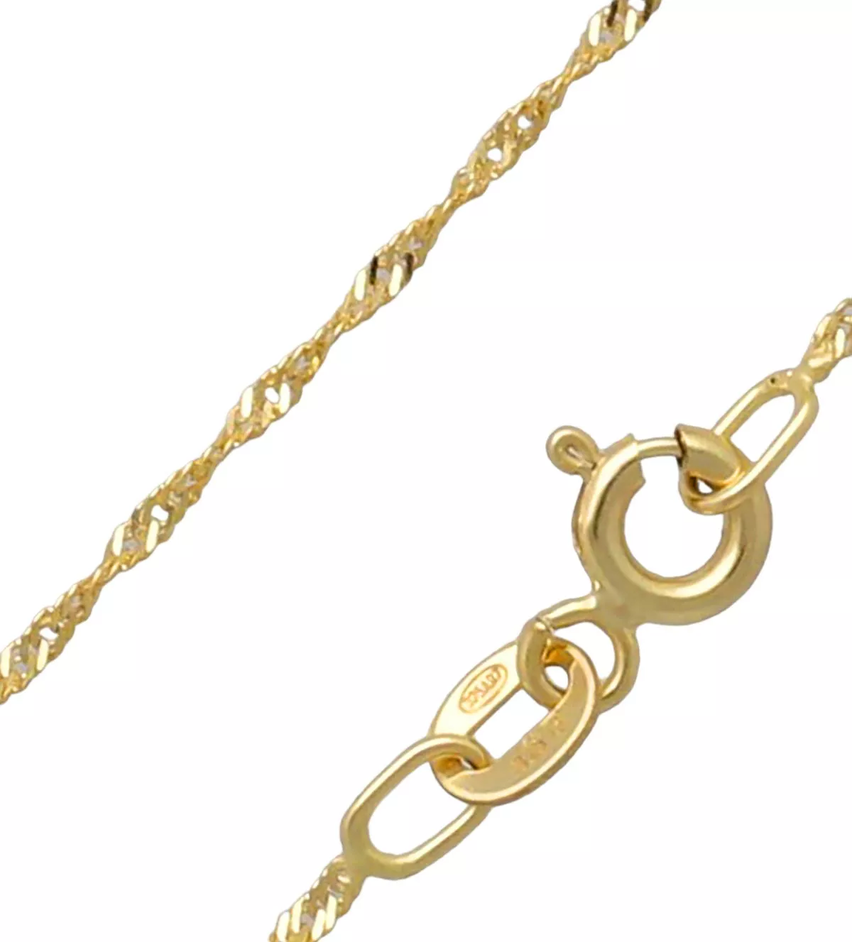 Realza tu elegancia con esta cadena de oro amarillo de 9 kilates (375 mm), diseñada en un exquisito estilo Singapur que aporta brillo y sofisticación a cualquier look. Con un cierre de seguridad tipo reasa, combina belleza y funcionalidad, convirtiéndola en una pieza imprescindible. Este modelo precioso está disponible en stock con entrega inmediata. ¡No dejes pasar la oportunidad de lucir esta joya exclusiva que se agota rápidamente!