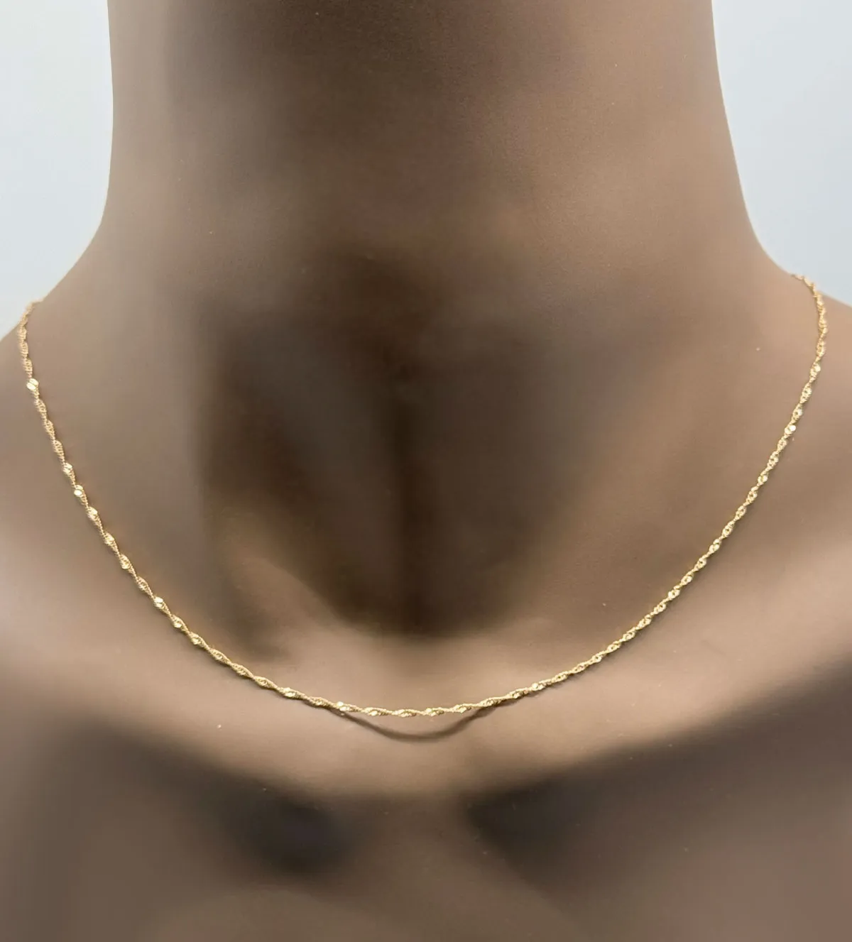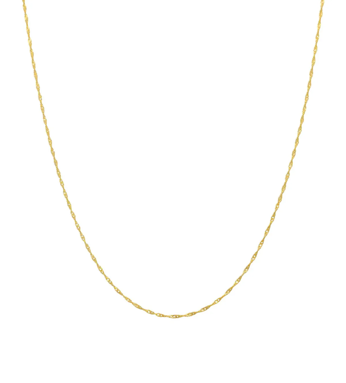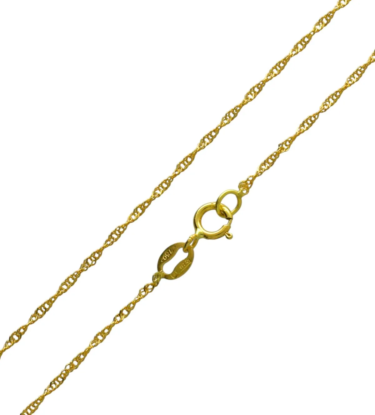 El diseño Singapur es sinónimo de sofisticación. Cada eslabón de esta cadena ha sido cuidadosamente trabajado para lograr un acabado perfecto. El diseño entrelazado no solo proporciona una textura atractiva, sino que también aporta una fluidez de movimiento excepcional. Además, el cierre de reasa ofrece una gran seguridad y comodidad para su uso diario. Esta cadena de oro se adapta a cualquier estilo, añadiendo un toque de elegancia a cualquier conjunto.