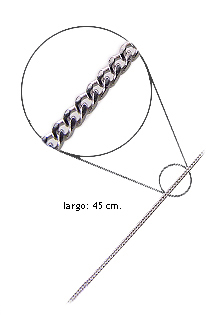 Cadena plata de ley 925 milésimas, modelo de eslabones barbados con cierre tipo reasa, el collar mide 45 centímetros y pesa 2,40 gramos, esta acabada en brillo con baño de rodio que evita cambios de color en la plata y le da apariencia de cadena de oro blanco.