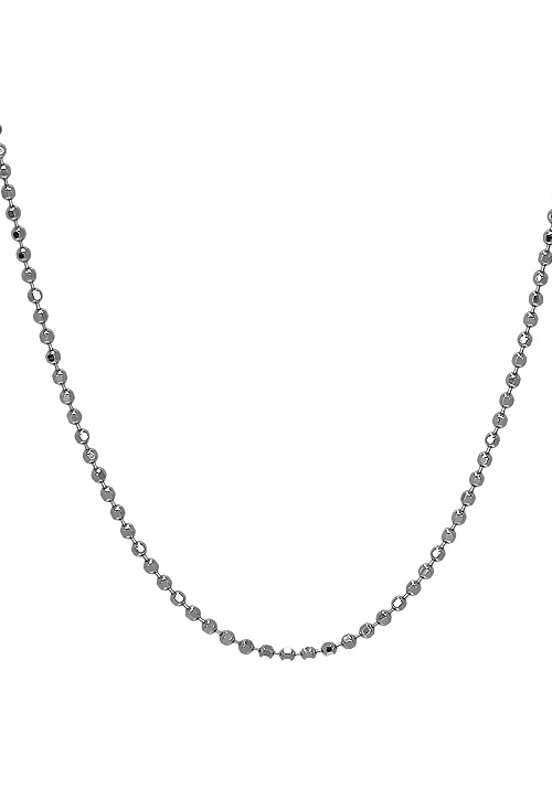 Cadena de plata eslabones como bolas o esferas lapidadas en planos, es un modelo precioso y original para utilizar como gargantilla adaptandole cualquier tipo de colgante, dispone de un cierre de seguridad tipo reasa muy cómodo y seguro, puedes utilizarla a diario sin miedo a que ennegrezca como suele ocurrir con las joyas de plata ya que esta cadena esta terminada en brillo con baño de rodio, el mismo baño que se utiliza con el oro blanco por lo que el aspecto es exactamente el mismo, también es un perfecto regalo que puedes acompañarlo con uno de nuestros modelos de colgantes de plata.