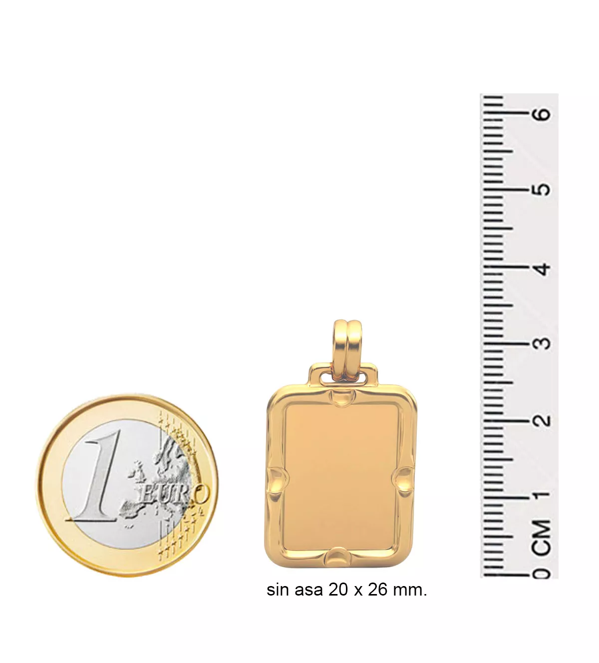 Chapa de identidad oro de 9 quilates, modelo rectangular con bisel de media caña en alto relieve y asa de escudo gallonada, perfecta para grabaciones personalizadas, incluso fotografías. Sus medidas de 20×26 mm y un peso ligero de 2.50 gramos la convierten en una pieza única y versátil. Disponible en stock con entrega inmediata y envío gratuito en la península. ¡Haz tu pedido ahora y asegura esta joya exclusiva antes de que se agote!