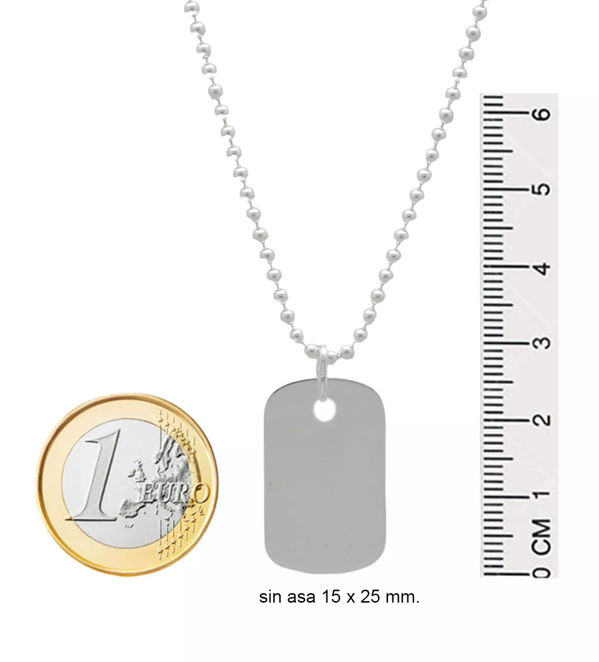 | Medidas | chapa 15×25 mm. grueso cadena 2 mm. largo 60 cm. |