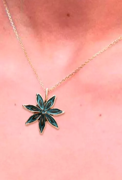 Este colgante tiene unas medidas de 22×22 mm, ofreciendo una presencia destacada y elegante. Cada pieza es única, recolectada cuidadosamente en el bosque y procesada artesanalmente para asegurar la más alta calidad y exclusividad. La flor de anís, con su diseño natural y detallado, es el centro de atención en este colgante, realzada por el acabado metalizado.
