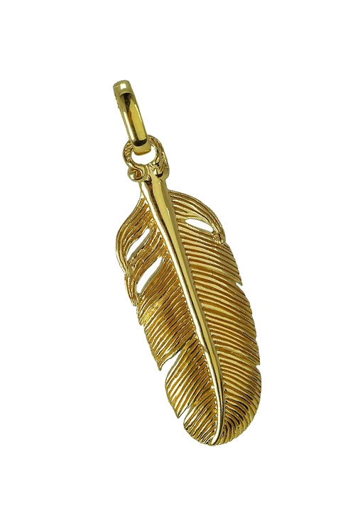 Colgante plata ley 925 milésimas chapada en color de oro amarillo marca Engelsrufer en forma de pluma, es un bonito, original y perfectamente realizado colgante para poder lucir tanto solo como acompañando a los famosos llamadores de ángeles de esta marca.x47 mm.