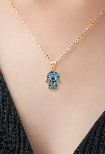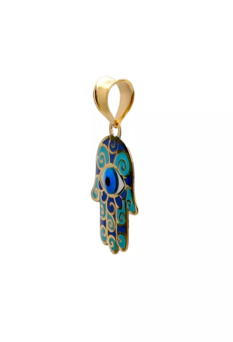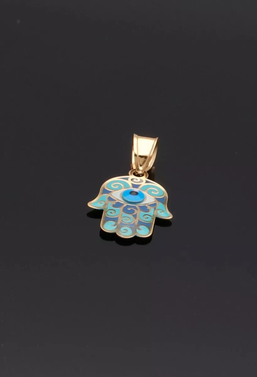 Colgante oro 18 ktes Mano de Fátima también conocido como Jamsa o Hamsa y ojo turco de la suerte aunados en un solo colgante de oro 18 ktes y esmalte, es una verdadera joya. Este precioso colgante de oro amarillo de 18 kilates representa la Mano de Fátima, también conocida como Hamsa, y el ojo turco de la suerte, dos símbolos llenos de significado. La belleza de este colgante radica en su esmaltado con preciosos y vibrantes colores, que realzan aún más su elegancia. Con cada tonalidad cuidadosamente aplicada a mano, este delicado detalle refleja tu personalidad única y sofisticada. Además del aspecto visualmente cautivador, el simbolismo detrás del colgante no pasa desapercibido. La Mano de Fátima y el ojo turco han sido considerados durante siglos amuletos protectores contra las energías negativas y el mal de ojo. Su diseño intrincado comprende cinco dedos extendidos, representando los cinco pilares fundamentales del islam: la fe, la oración, el ayuno, la caridad y la peregrinación. y en el centro de la palma se encierra un precioso ojo esmaltado de igual manera en sus típicos colores.