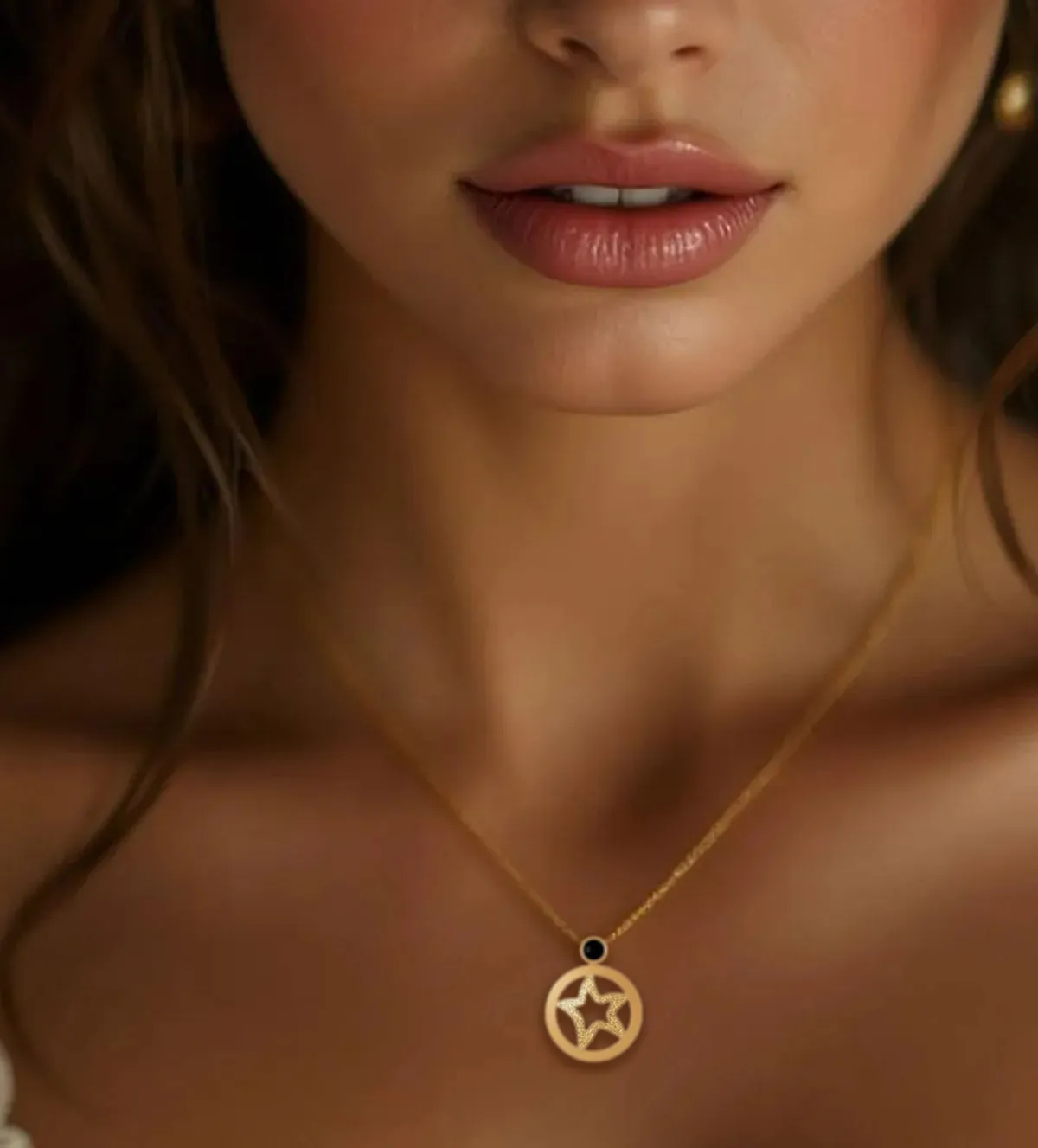 El colgante de oro estelar es mucho más que un accesorio: es una pieza que encierra simbolismo, elegancia y un diseño sofisticado. Elaborado en oro amarillo de 18 quilates, su estructura combina la fuerza de los materiales nobles con un acabado lleno de brillo. La estrella calada de cinco puntas encerrada en un círculo transmite armonía, mientras que el ónix en talla cabujón aporta un toque de misterio y sofisticación.