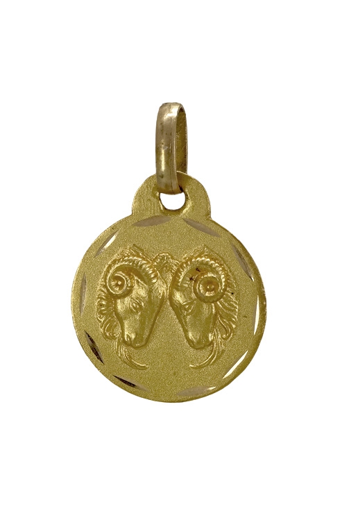 Colgante oro amarillo 1ª ley 18 kilates horóscopo aries de diseño tradicional redondo y motivo estampado con cortes lapidados como bisel mide 13 milímetros de diámetro y pesa 1,30 gramos, los pertenecientes a este signo son personas con un gran sentido del deber, muy trabajadores, emprendedores y enérgicos, su color es el rojo y su piedra el rubí.y pertenecen a este signo los nacidos entre el 21 de marzo y el 20 de abril.