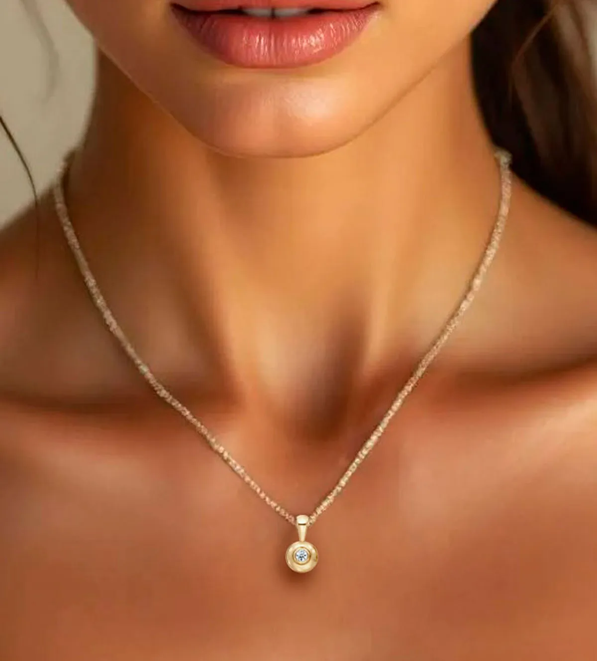 Con un diámetro equilibrado, el colgante ofrece una presencia sutil pero visible. Su tamaño ha sido cuidadosamente estudiado para aportar luminosidad sin resultar excesivo. Gracias a su asa integrada, puede colocarse en diferentes tipos de cadena, adaptándose tanto a cuellos finos como a estilos más clásicos. Es una joya cómoda, ligera y fácil de llevar durante todo el día.