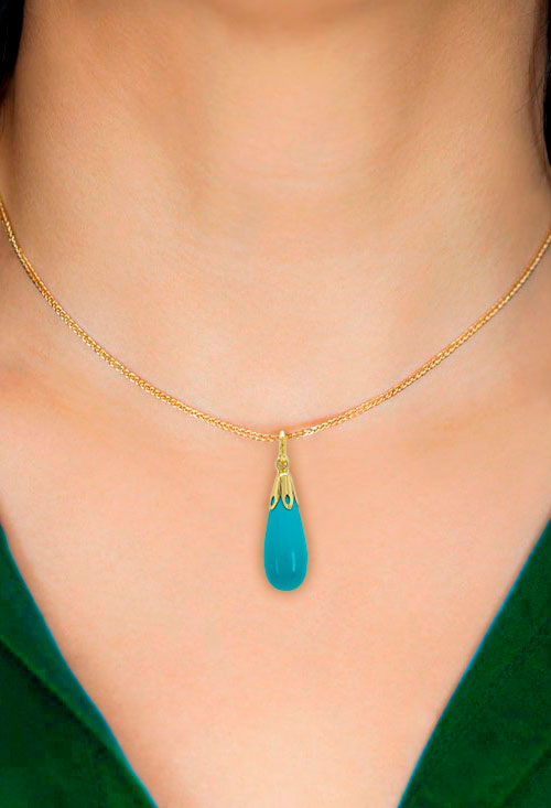 Características: Colgante para mujer, realizado con pasta de turquesa en forma de lagrima y con enganche y asa redonda en oro amarillo de 18 kilates, con un tamaño de 7×19 milímetros y 0,90 gramos.