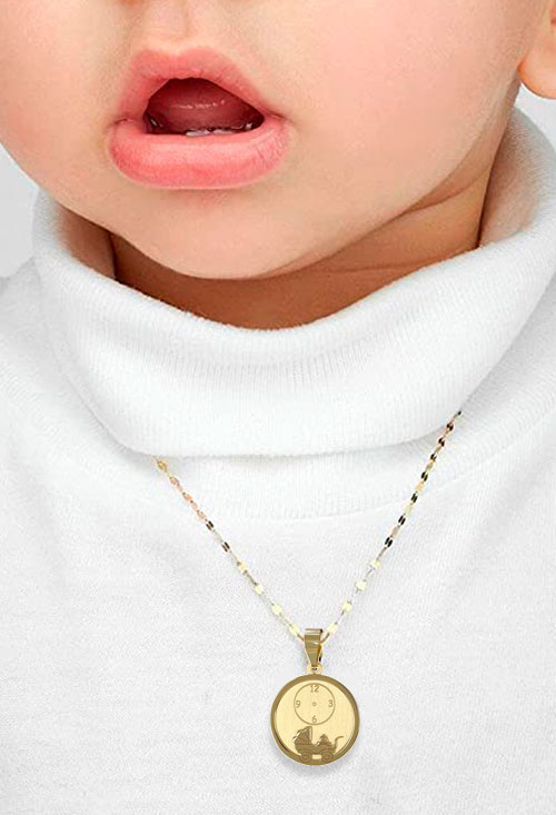 Colgante oro 18K disco con reloj y cochecito de bebe ¿Qué tal, amigos? ¿Alguna vez han buscado el regalo perfecto para ese recién nacido tan especial? Pues hoy les presentamos la increíble Medalla del Reloj o Disco de Oro Amarillo 18 quilates con un cochecito de bebé. ¡Vaya joyita! Este disco mide 14 milímetros de diámetro y pesa 1 gramo. Pero no se confundan por su tamaño, ¡es una auténtica maravilla! Está terminado en mate y brillo, porque nuestros bebés merecen lo mejor. Pero eso no es todo, queridos amigos. La magia está en el relojito que viene incluido en esta medallita. ¿Adivinen qué pueden grabar ahí? ¡La hora exacta a la que el pequeño angelito decidió venir al mundo! Imagínense tener ese momento inolvidable siempre presente.