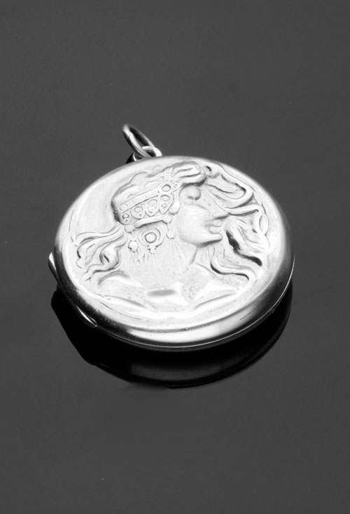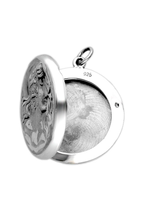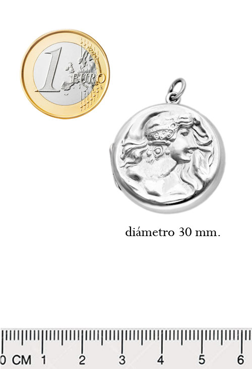 Colgante de plata guardapelos, caja de forma circular que llamamos guardapelos pero también sirve como pastillero, portafotos o para guardar cualquier otro tipo de cosa o reliquia, su tapa esta adornada con la estampación de una cara femenina que para este tipo de joya recibe el nombre de Madonna, un regalo original que no espera y que sin embargo le guardara el recuerdo del momento durante toda su vida.