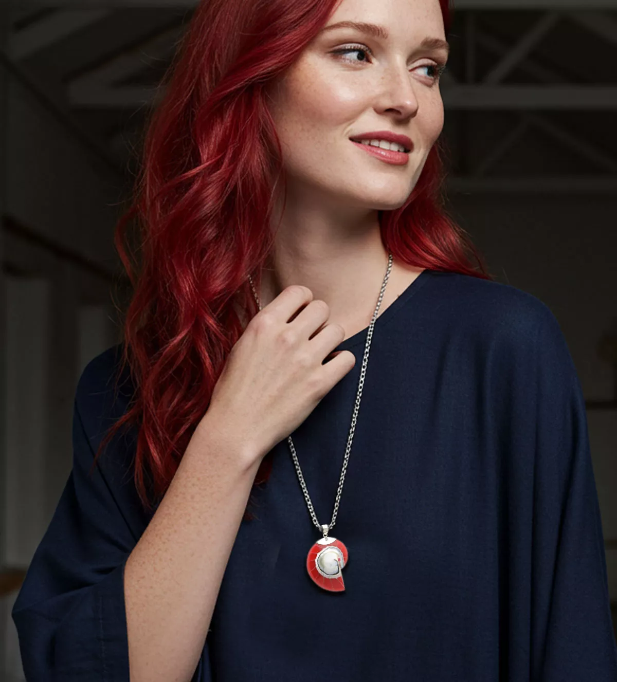 La forma de caracola convierte a este colgante de plata en una pieza especial, ideal para amantes del mar y la naturaleza. La fusión de tonos rojos vibrantes y blanco nacarado crea un contraste sofisticado, perfecto para destacar sobre cualquier look.