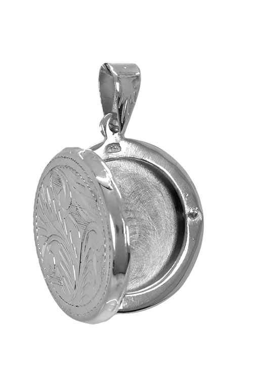 Guardapelos de plata con forma circular realizado con plata de ley 925 milésimas, se abre y se cierra mediante un sistema de bisagra con ajuste de clic, esta decorado con grabado de motivos florales con la tecnica de lapidado y dispone de un asa de escudo para poderlo colgar de diferentes tipos de collares, los guardapelos se pueden utilizar como relicarios, como portafotos, como pastilleros o darle cualquier otro tipo de uso pero siempre resultan un complemento de adorno que te gusta lucir en todo tipo de ocasiones.