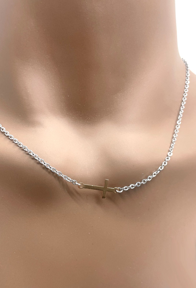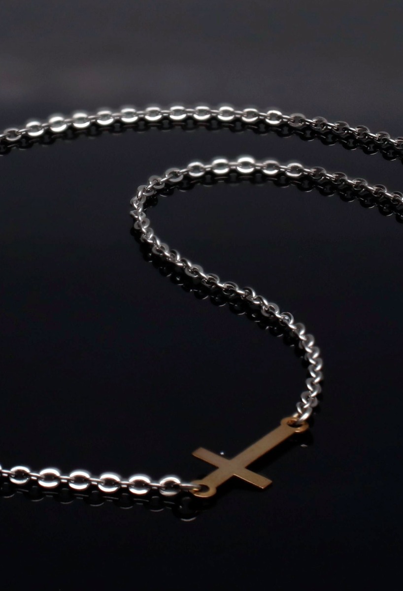 Gargantilla de acero y oro, cadena de eslabones forzados con cierre tipo reasa con motivo en forma de cruz horizontal realizada en oro amarillo de primera ley, modelo muy actual que aporta la novedad del sentido de la cruz a lo largo de la cadena en lugar de ir colgando, combinala con pendientes o pulseras a juego.