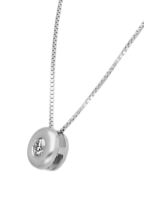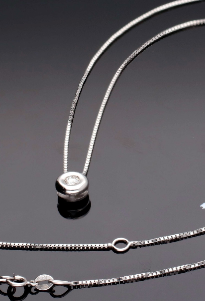 Gargantilla oro blanco con diamante talla brillante, clásico y actual diseño porque nunca pasa de moda y siempre queda bien el mejor regalo para dejar un recuerdo de una ocasión especial, cadena modelo veneciano con cierre de seguridad tipo reasa y largo adaptable a dos medidas de la que cuelga el chatón sin asa para que quede más integrado al collar.