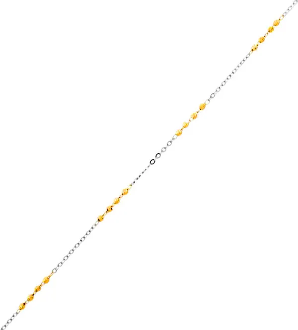 Gargantilla de oro que enamora por su encanto bicolor y su diseño elegante. Realizada en oro de 18 kilates con delicados eslabones planos y bolas lapidadas que aportan un brillo sofisticado. Esta joya destaca por su versatilidad y su estilo único que realza tu cuello con discreta distinción. Perfecta para cualquier ocasión y fácil de combinar con tus looks favoritos. ¡Consigue la tuya ahora mismo en Rubí Joyeros, con envío inmediato y stock limitado!
