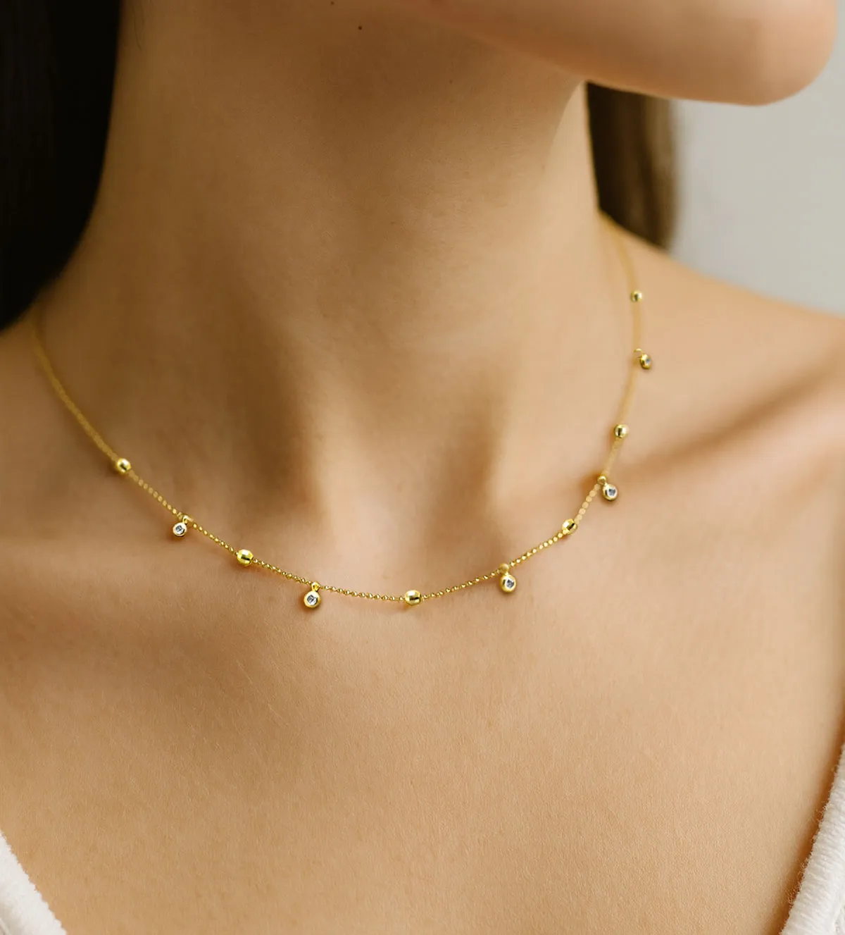 El diseño de esta gargantilla de oro equilibra la simplicidad de la cadena de bolitas con la sofisticación de las piedras y los detalles facetados. El contraste entre los circones engastados y las esferas brillantes genera un efecto de movimiento y destello que captura todas las miradas.