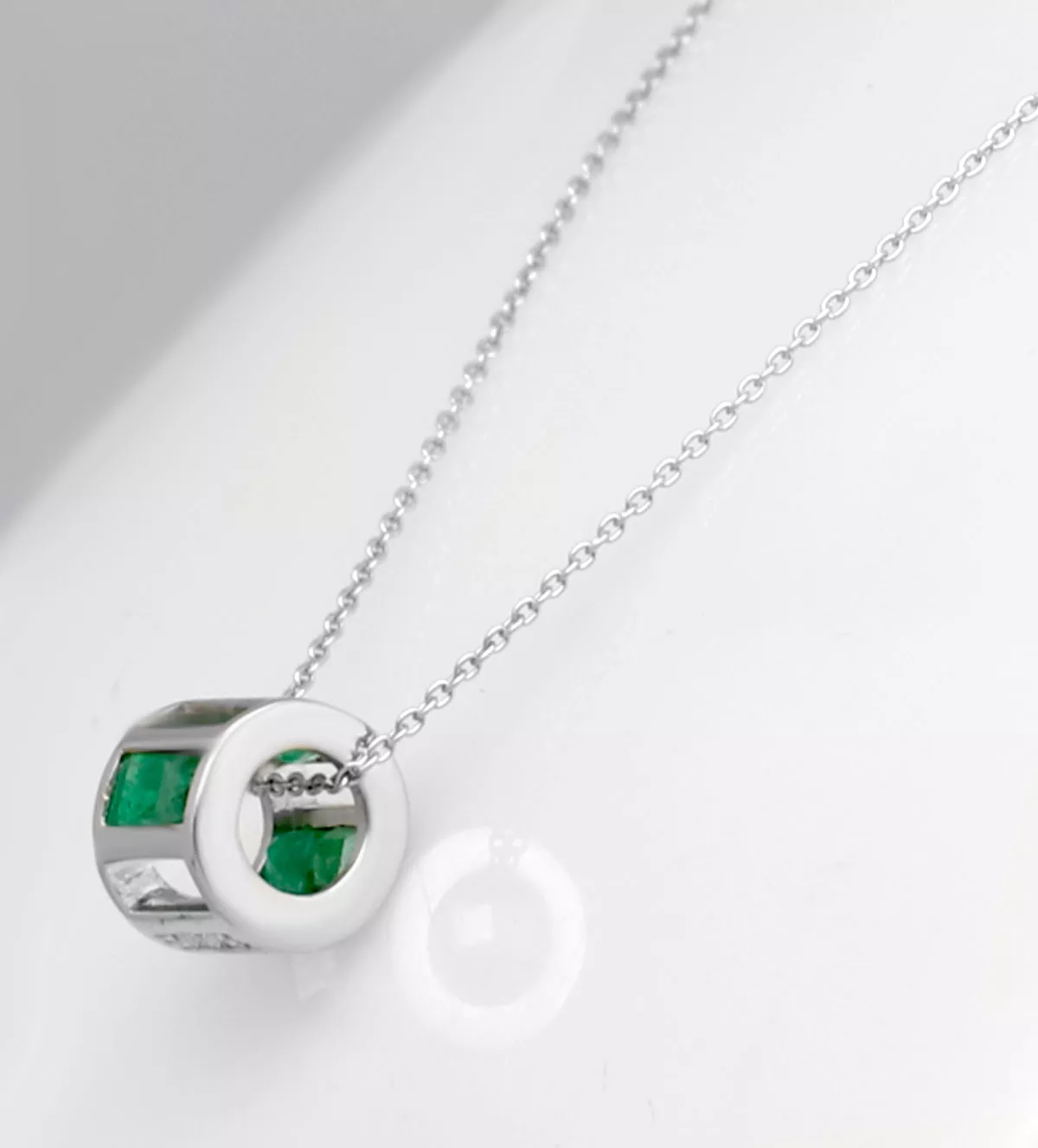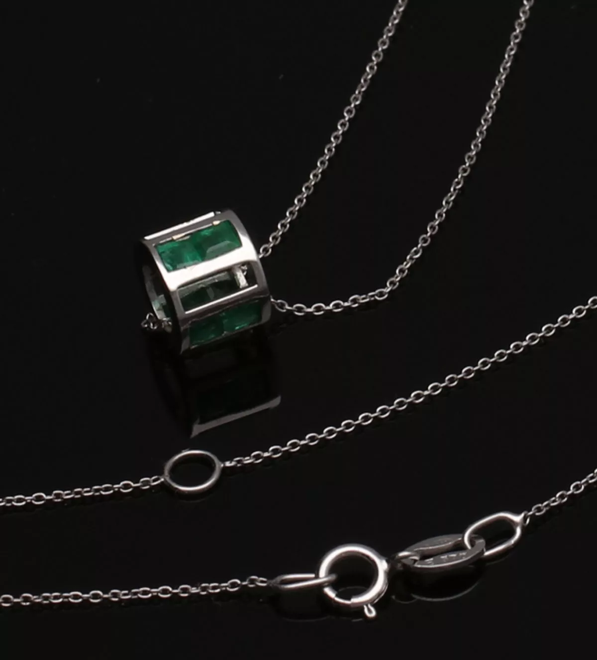 Gargantilla de oro blanco “Cilindro” cadena fina de eslabones con motivo cilíndrico formado por galerías de esmeraldas y brillantes.
