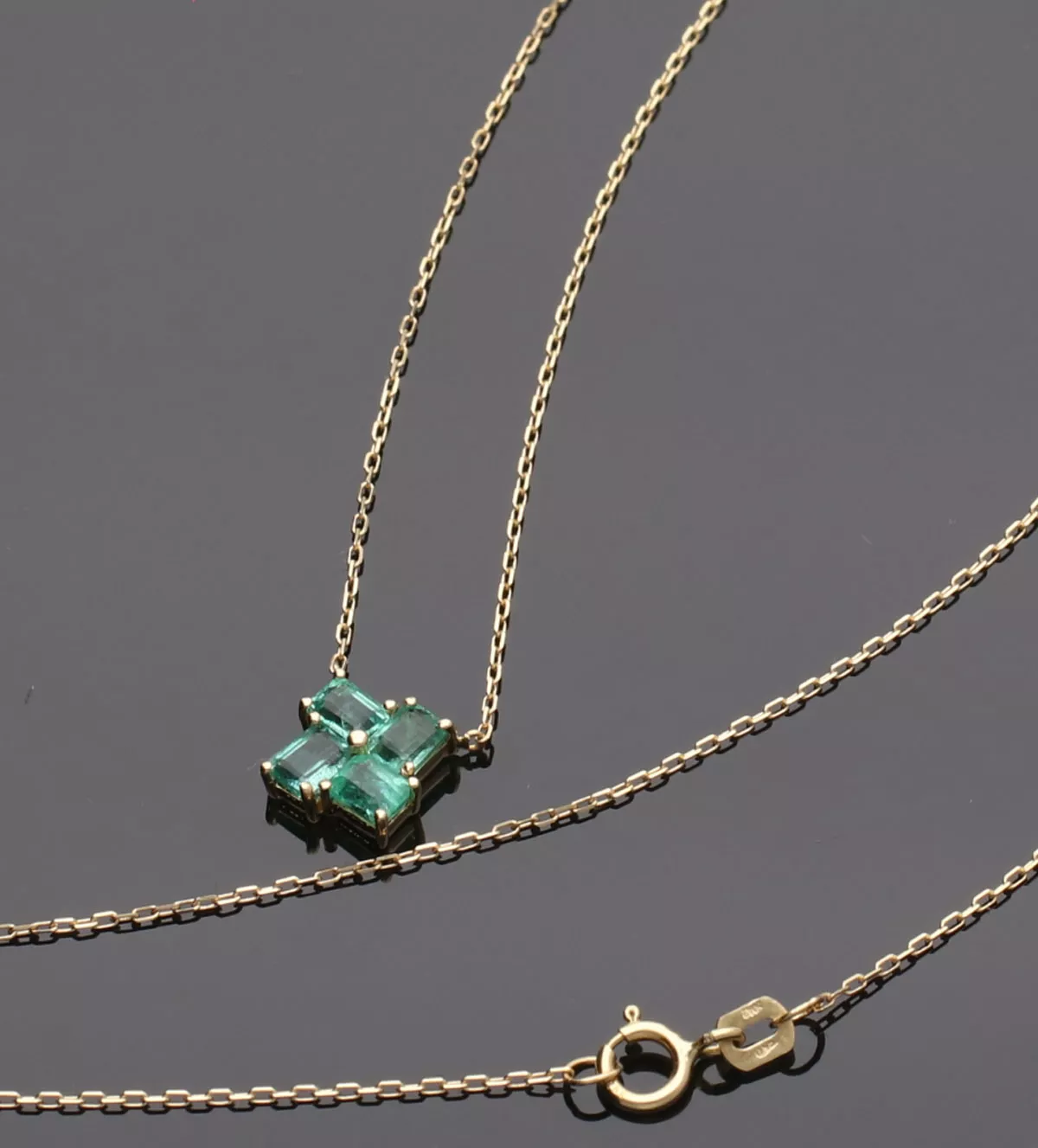 Gargantilla de oro amarillo “Esperanzas” cadena fina de eslabones con un motivo formado por 4 esmeraldas de talla rectangular formando un extraordinario mosaico.