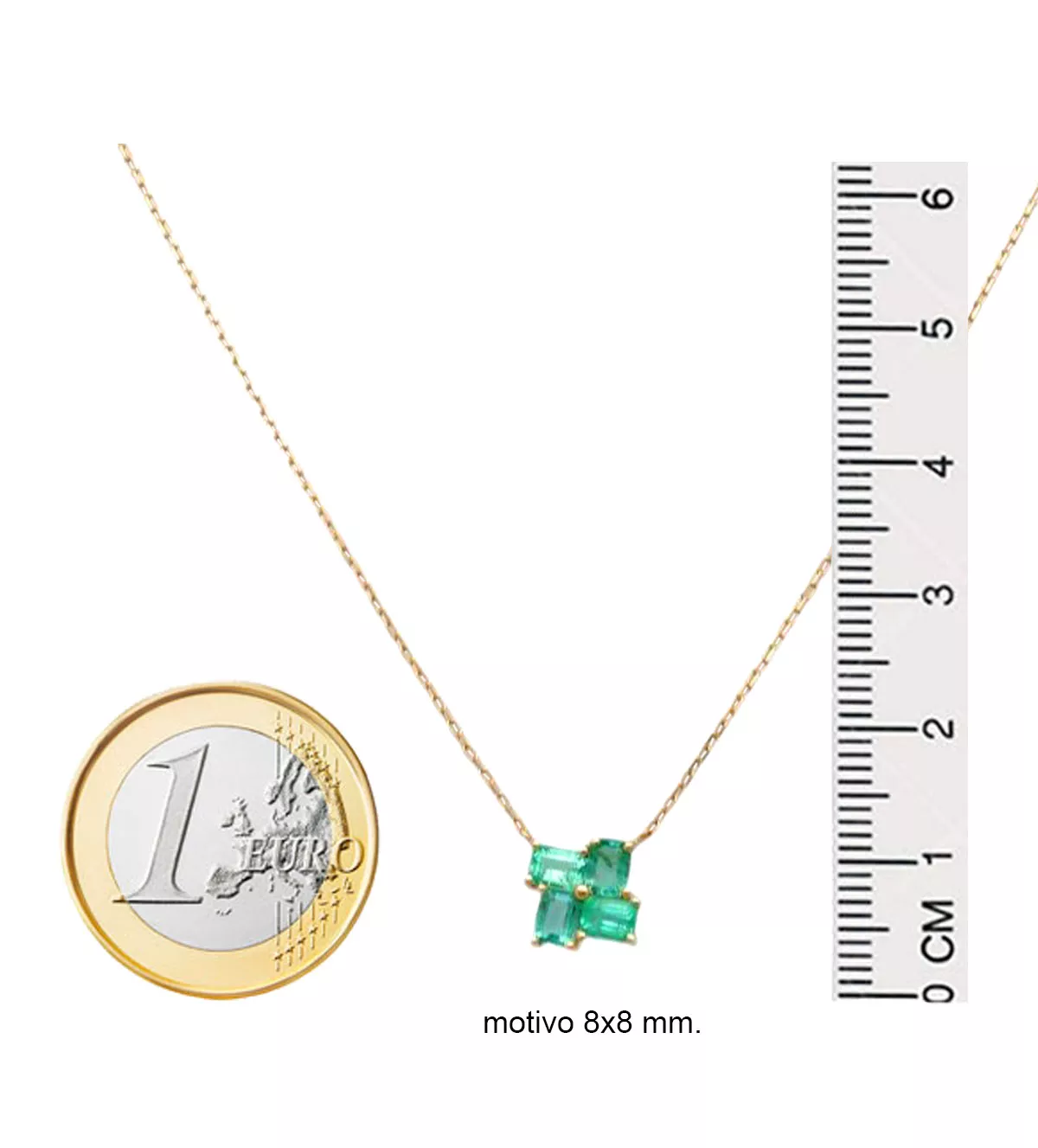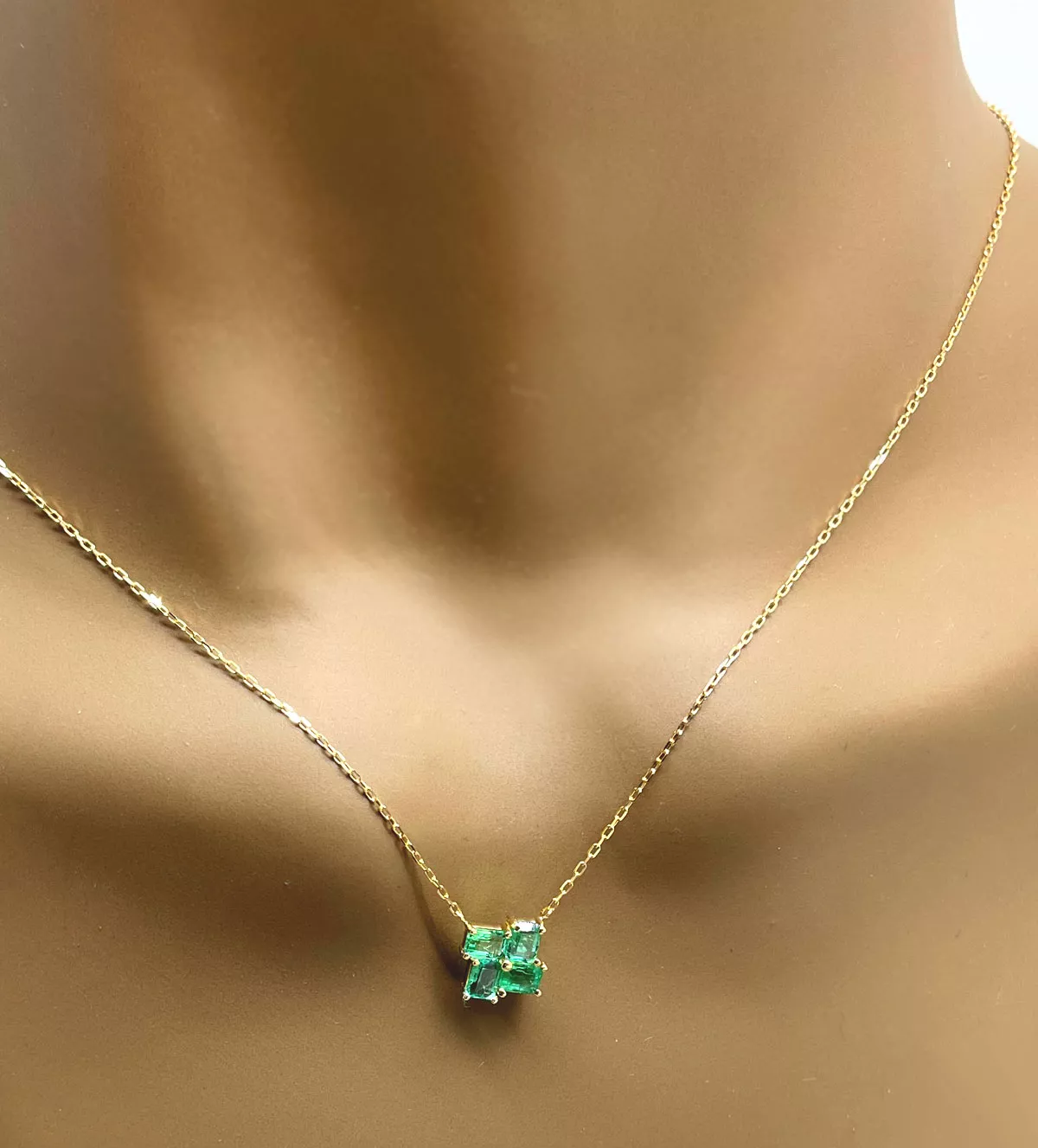El diseño de esta gargantilla es el equilibrio perfecto entre modernidad y tradición. La fina cadena de eslabones forzados, terminada con un cierre de reasa, asegura comodidad y un ajuste ideal. Su motivo central cuadrado, compuesto por cuatro esmeraldas alineadas con precisión geométrica, crea un efecto de mosaico hipnótico que destaca por su originalidad y delicadeza. Esta combinación de elementos hace de ESPERANZAS una joya única que eleva cualquier conjunto.