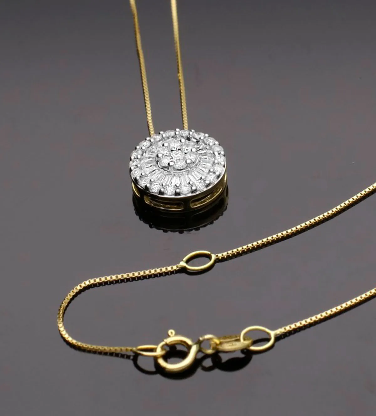 El elemento central de esta joya es su motivo circular con múltiples orlas que concentra toda la atención con un efecto visual armónico. Los diamantes dispuestos en talla brillante rodean otros en talla trapecio, generando una sinergia de brillo sutil y moderno. La cadena veneciana de eslabones finos potencia la delicadeza de la pieza, haciendo que luzca ligera pero impactante.