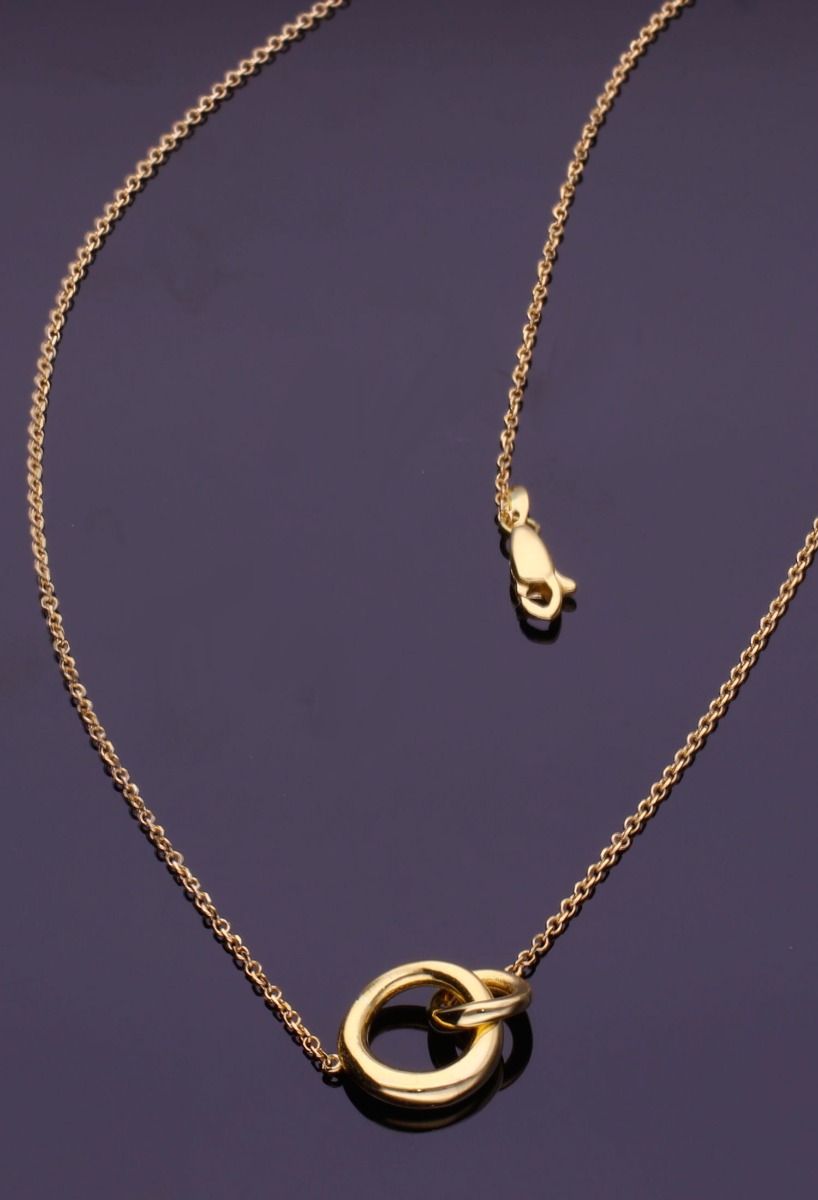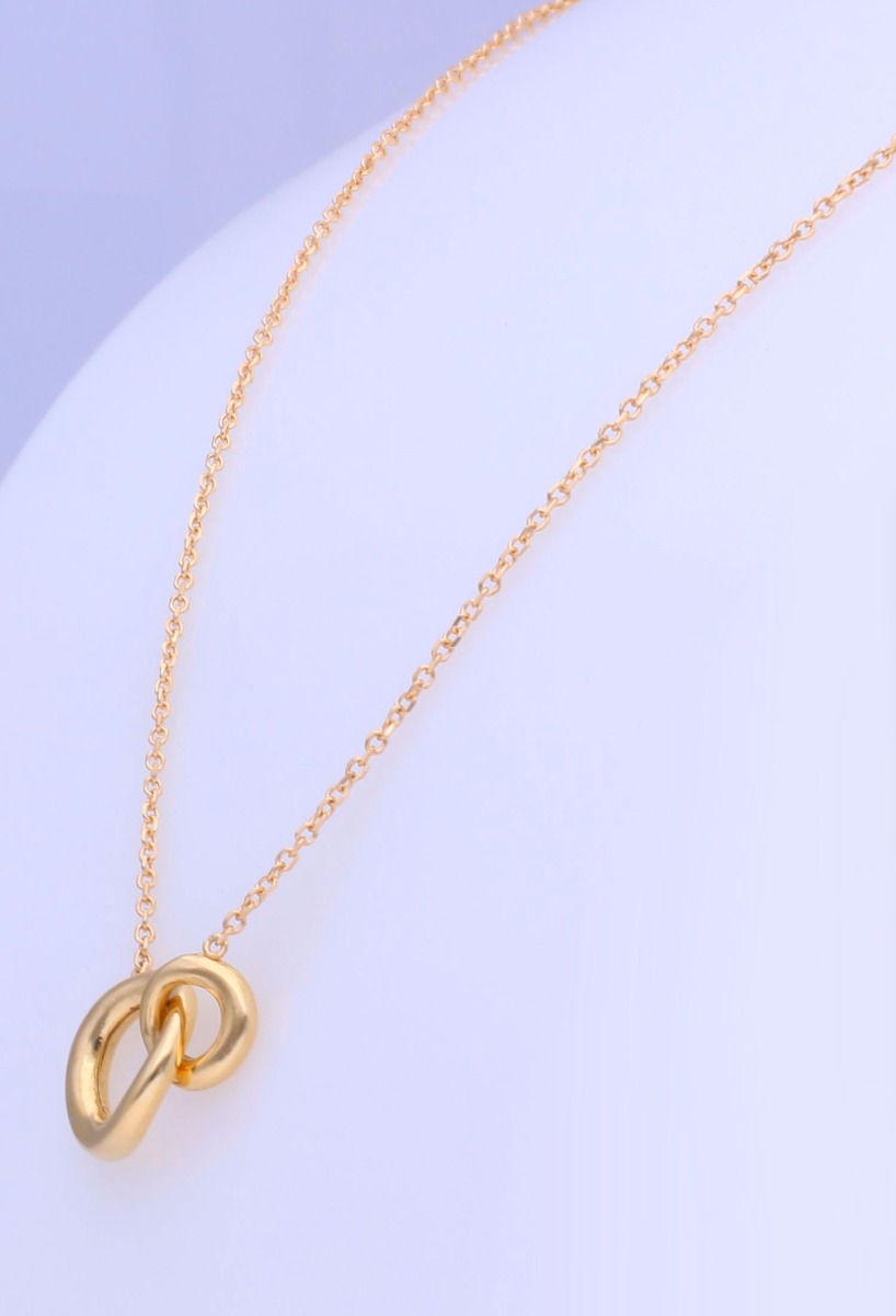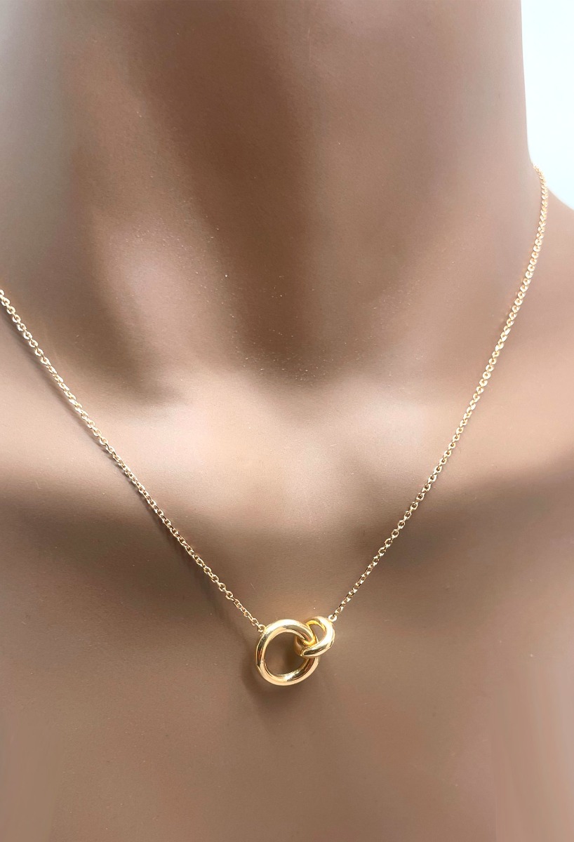 Gargantilla oro 18 ktes motivo asas, bonito modelo de gargantilla que utiliza una cadena maciza de eslabones tipo rolo con cierre de mosquetón que en su centro lleva un precioso motivo formado por dos asas de diferente medida chanela redonda enlazadas entre si, es un motivo que simboliza unión eterna por lo que convierte esta joya en un perfecto regalo de enamorados, aprovecha nuestro gran descuento y regálale una joya que llevara durante toda la vida.