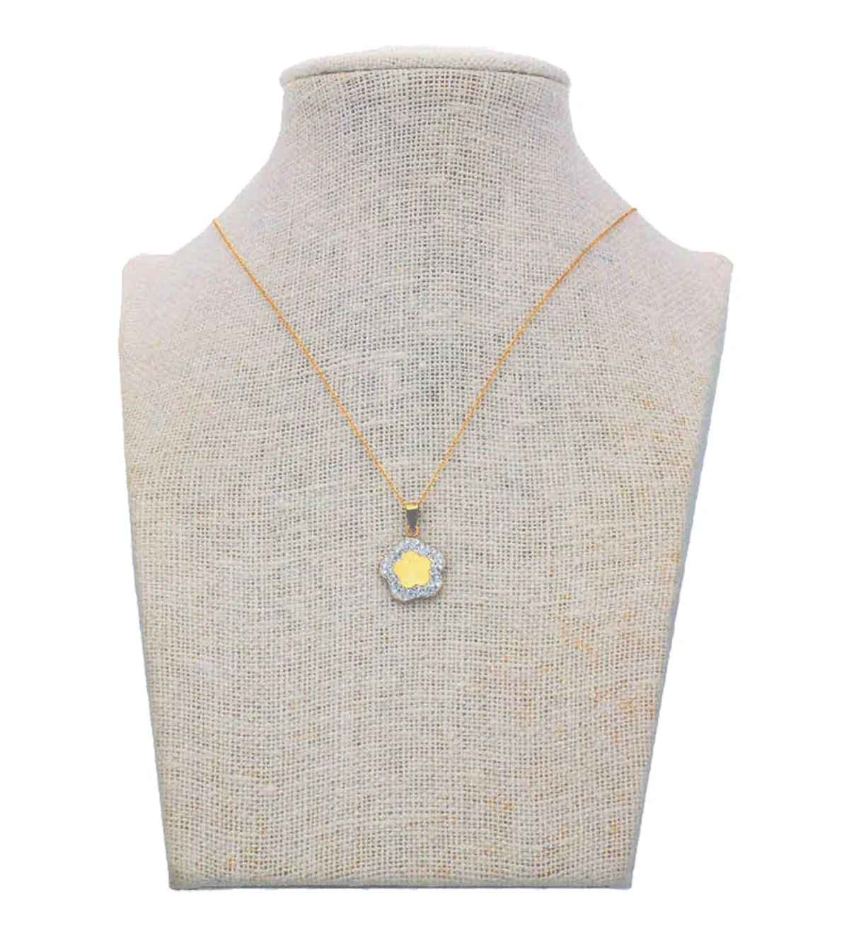 El diseño de esta gargantilla de oro combina una cadena fina con un colgante central de 12 mm de diámetro. La flor, con su centro liso y rodeada de destellos brillantes, refleja feminidad y delicadeza. El asa en forma de escudo añade un detalle distintivo que le confiere carácter y protagonismo, convirtiéndola en una joya que realza cualquier look.