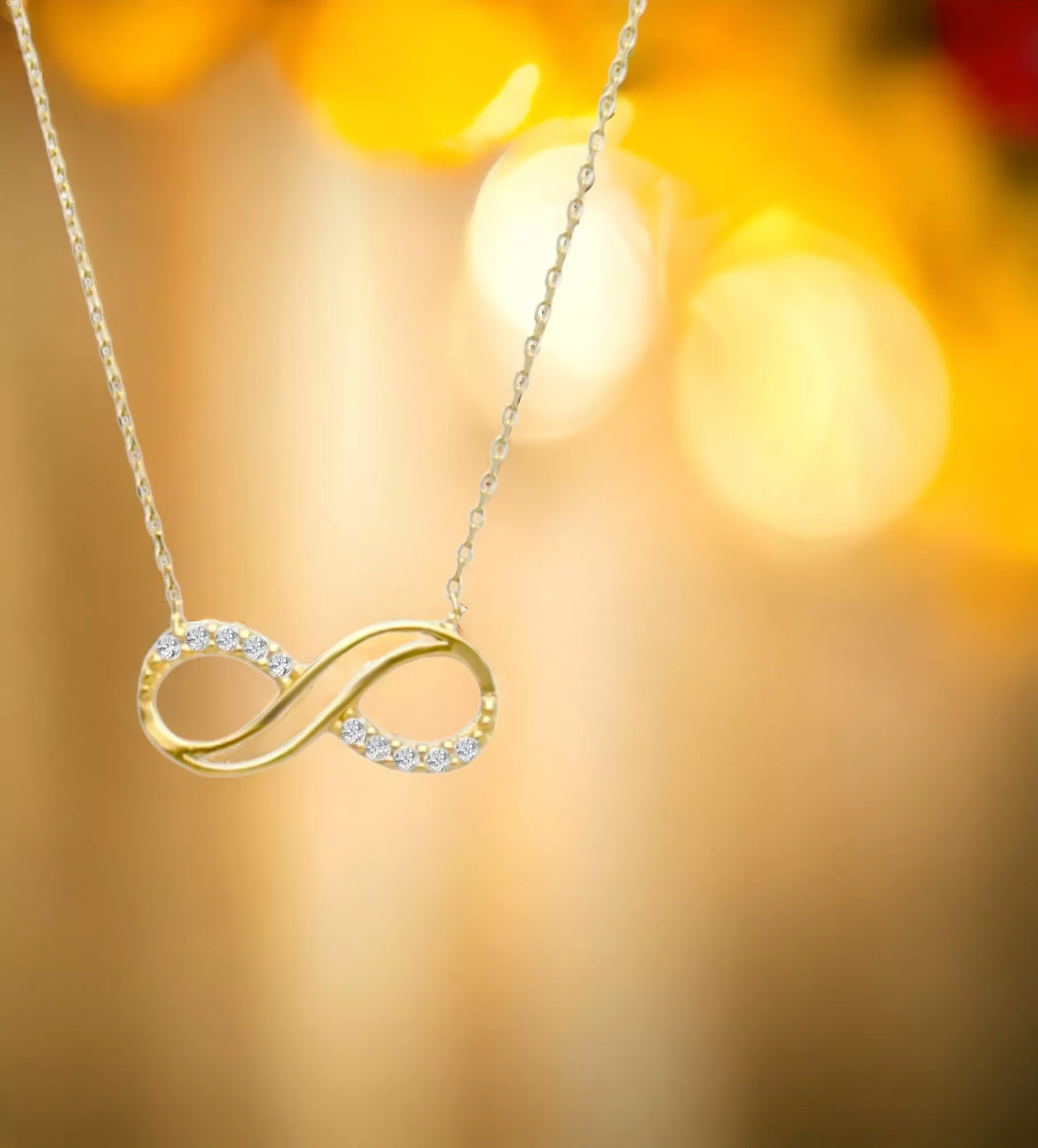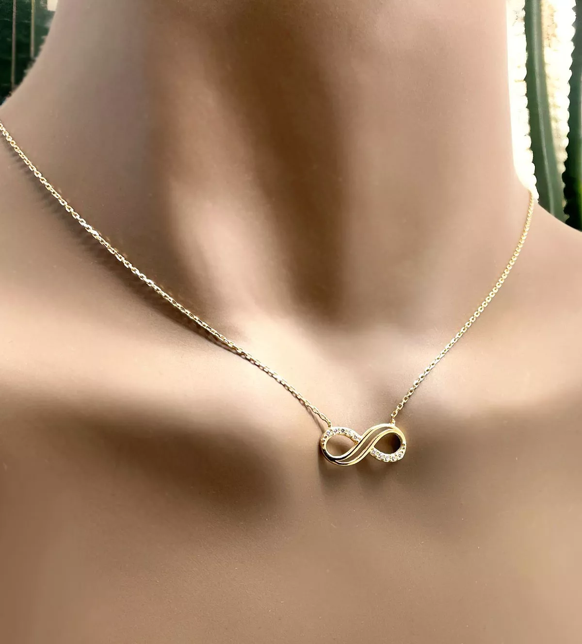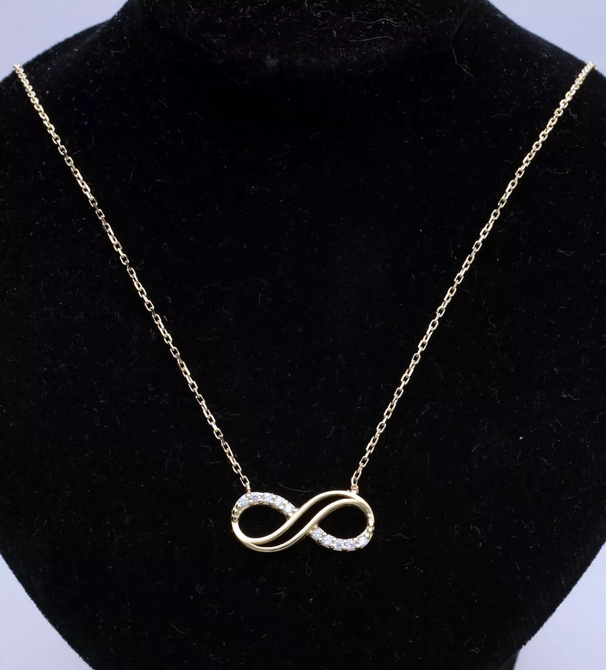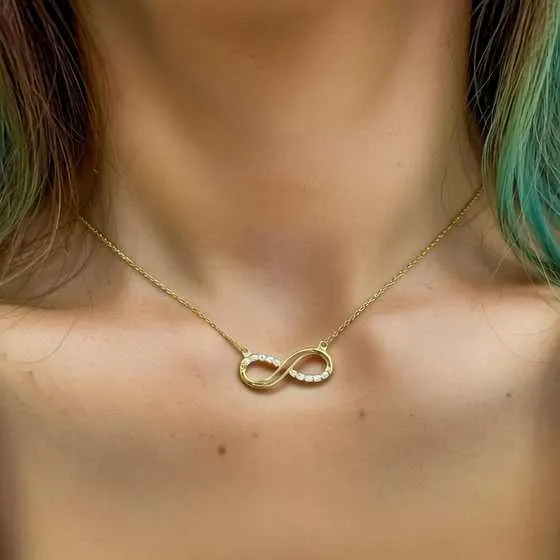 Nuestra gargantilla presenta un motivo infinito, símbolo del amor eterno, elaborado en oro amarillo de alta calidad. Cada eslabón de la cadena fina está meticulosamente diseñado para ofrecerte una pieza que no solo es hermosa, sino también llena de significado. Además, está decorada con circonitas que añaden un brillo extra y un toque de glamour a tu look.