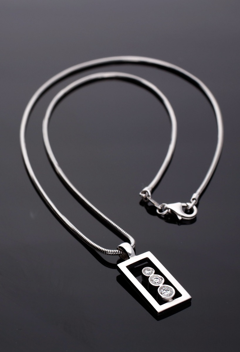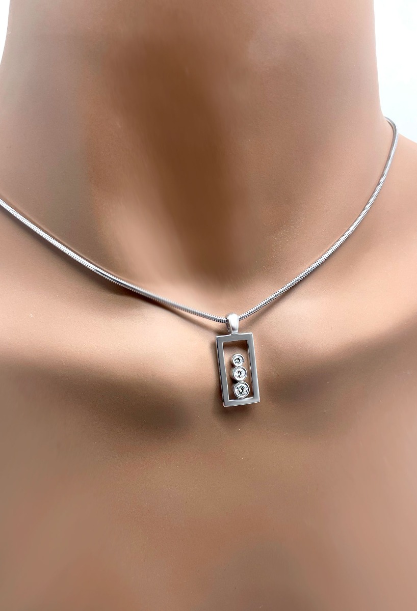 Gargantilla oro blanco 18 kilates con diamantes, una autentica joya de diseño minimalista, el motivo combina el rectángulo que inspira seguridad en si mismo y el orden de tu vida con 3 circulos en disminución que te hablan de la plenitud y la eternidad. Una gargantilla para lucir sea cual sea tu estilo siempre aporta un detalle elegante y distintivo de tu personalidad. El motivo lleva en cada uno de los circulos un diamante de diferente diámetro creando una cascada en aumentativo, dicho motivo cuelga de una solida cadena tipo cordón tupido conocida como cola de topo, el cierre es super seguro un mosquetón reforzado de alta calidad, toda la gargantilla esta terminada en brillo baño de rodio.
