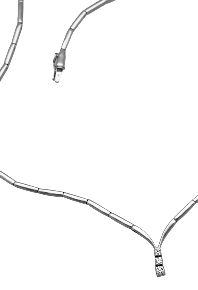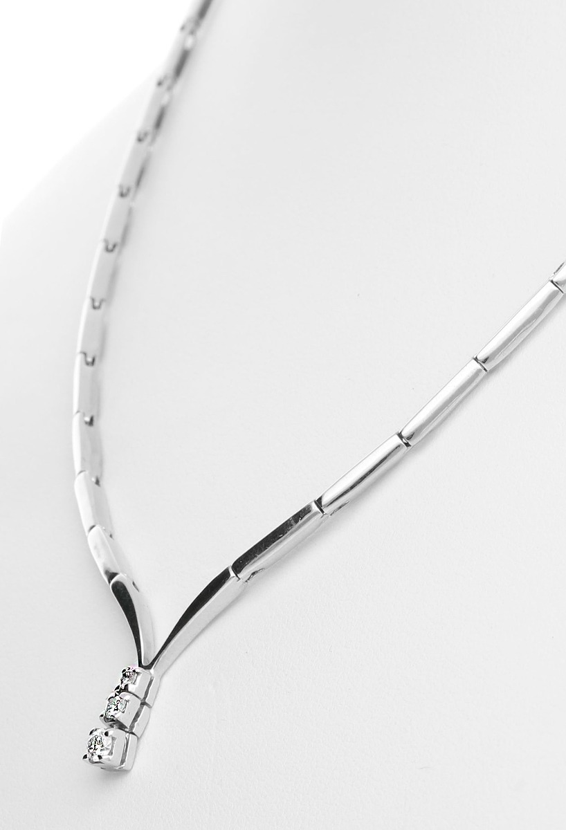 Gargantilla oro blanco 18 kilates con diamantes, fina y elegante hace resaltar la belleza femenina fijando en la misma todas las miradas, lucirla en ocasiones o de forma más habitual siempre te sentirás más especial, esta formada por tramos rígidos que formando un pico en su parte inferior esta rematada con 3 diamantes talla brillante dispuestos de menor a mayor y que se cierra con un sistema de lengüeta y cerrojillo seguridad de ocho en un lateral.