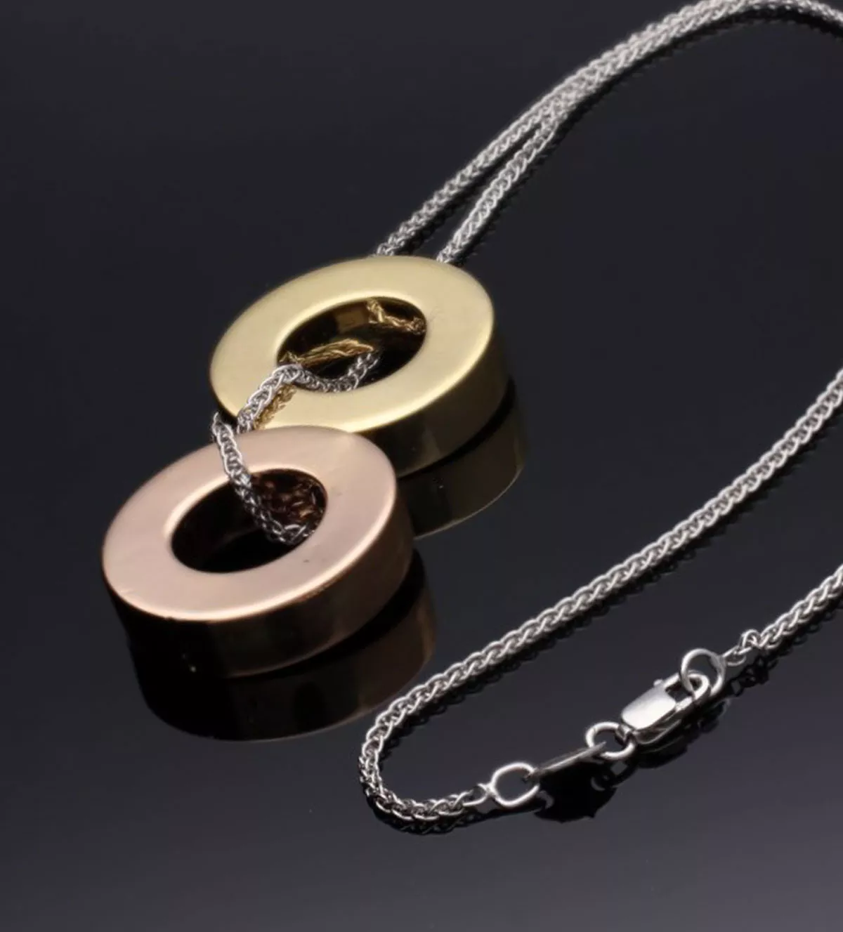 El diseño moderno de esta gargantilla destaca por su simbolismo único. Los dos colgantes en forma de donuts representan la unión infinita, el amor eterno y la conexión entre dos almas. Suspendidos de una fina cadena, los diferentes tonos de oro (amarillo, blanco y rosa) se combinan armoniosamente, creando una pieza que equilibra la tradición y la modernidad.