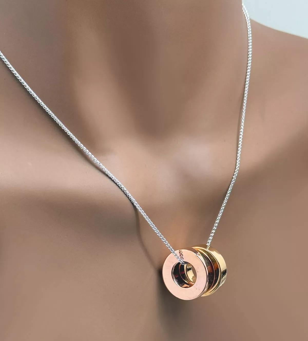 Lo que diferencia a esta gargantilla es su simbolismo profundo y su diseño tricolor. Los colgantes en forma de donuts, sin principio ni fin, reflejan la eternidad del amor. Además, los tres tonos de oro permiten combinarla fácilmente con otras joyas y estilos, siendo una pieza versátil para cualquier evento o uso diario.