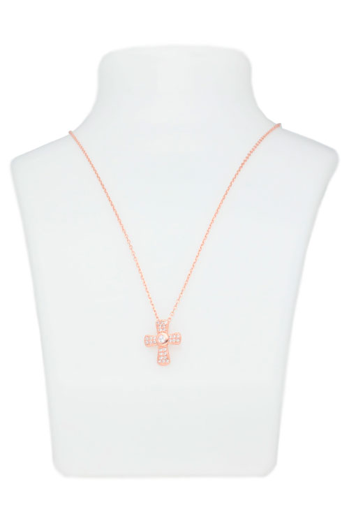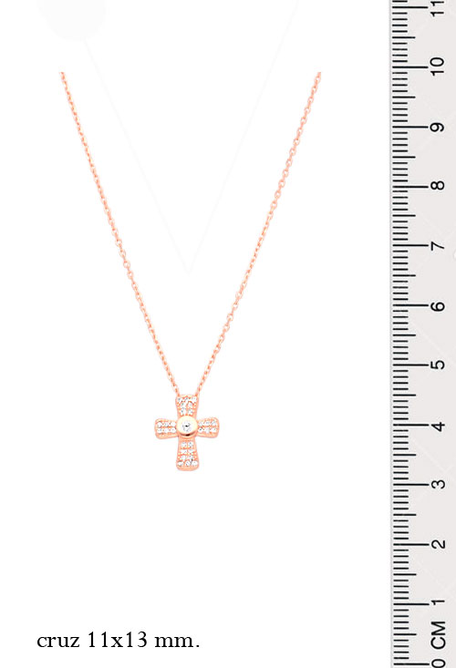 Cruz de plata chapada chapada IP rosa con circonitas, bonito diseño de cruz latina cuajada de circonitas en sus astas con una circonita de mayor tamaño en la intersección de las mismas, lleva incluida una cadena igualmente de plata chapada en mismo tono que se adapta a dos largos diferentes y se cierra con una reasa.
