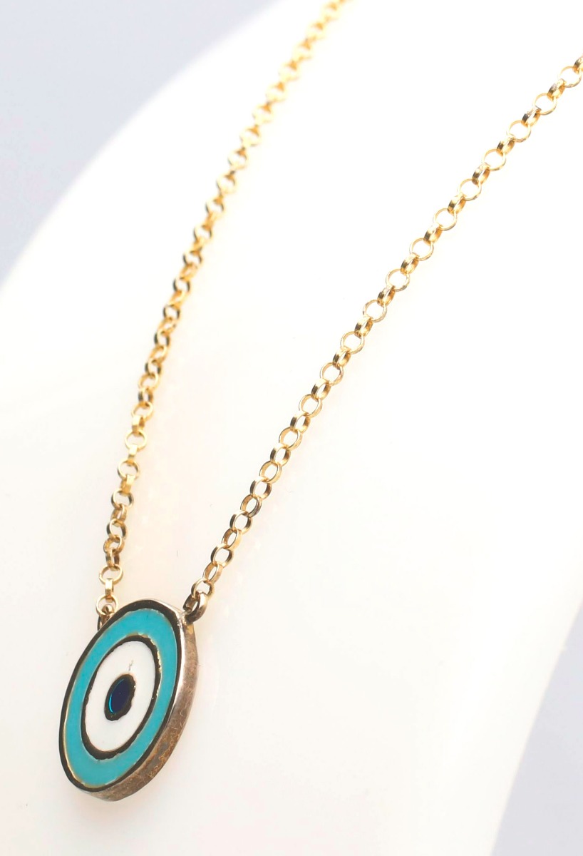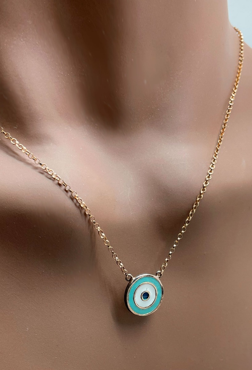 Gargantilla de plata chapada ojo turco con esmalte tricolor, motivo conocido como ojo turco, elaborados en plata de ley 925 milésimas hipoalergénica, plata chapada en oro de color amarillo, esmaltados en blanco azul y negro en círculos concéntricos, con cadena de eslabones tipo rolo de 40 centímetros de largo, el motivo ojo turco mide 12 milímetros de díametro y tiene un peso de 2.40 gramos.