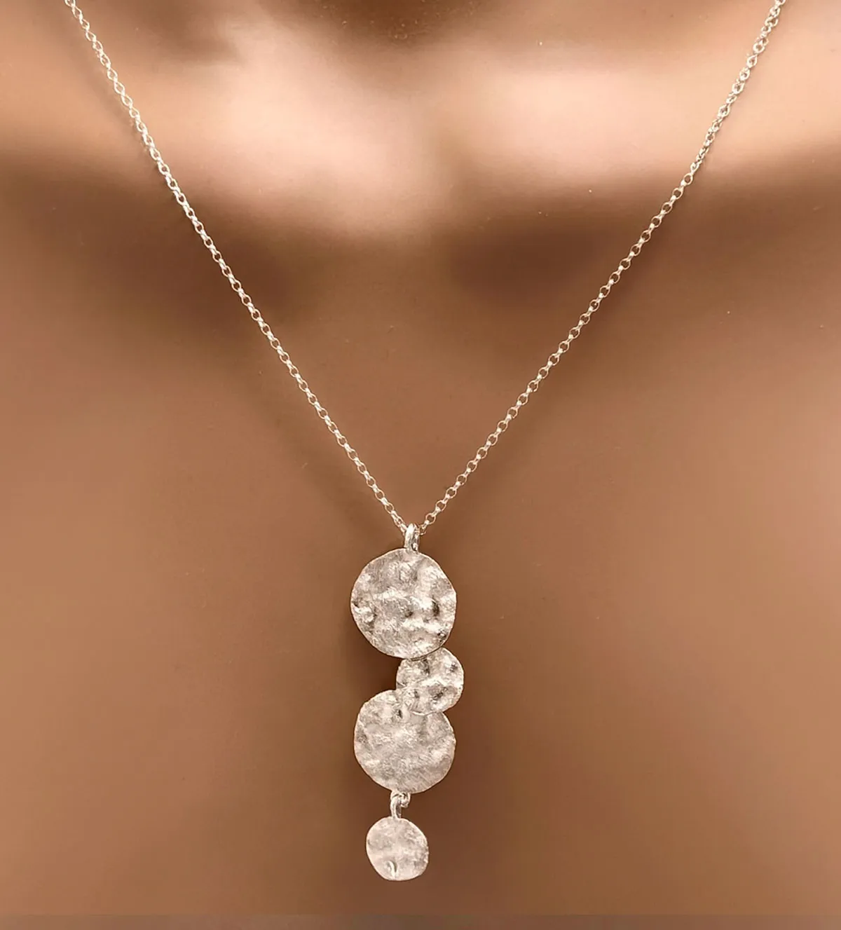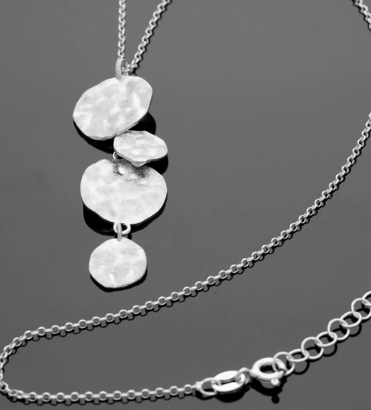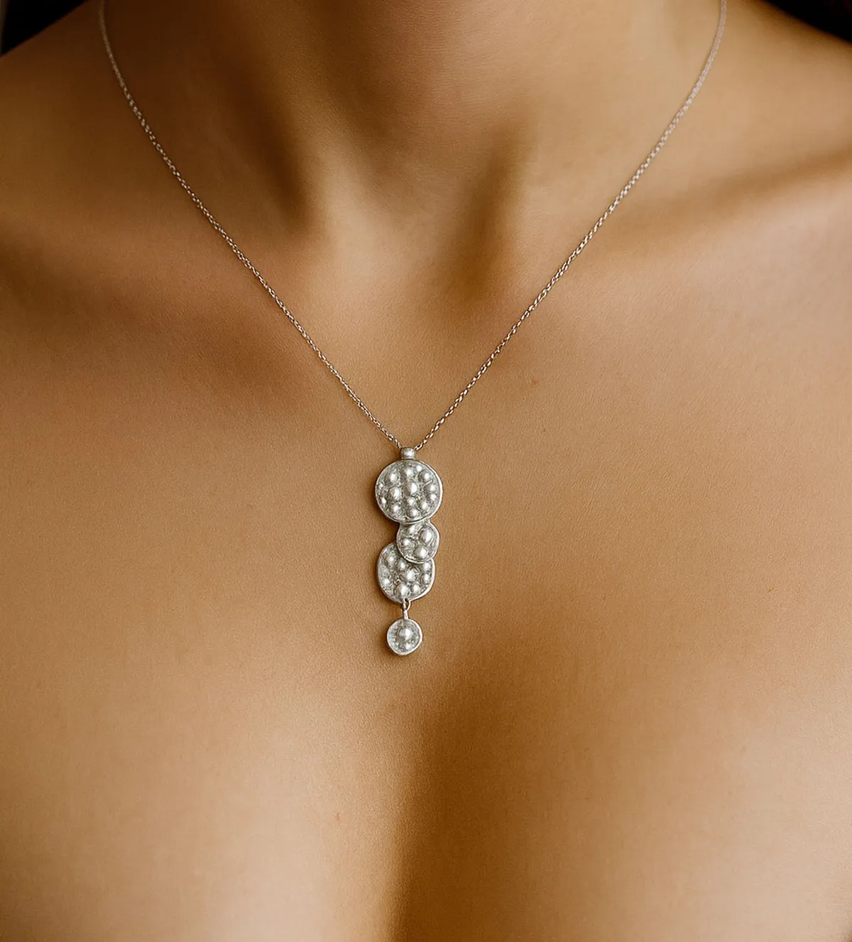 El motivo central está formado por cuatro círculos de diferentes diámetros, cada uno con un acabado texturizado y relieves inspirados en burbujas. Este detalle artesanal aporta dinamismo y un encanto moderno a la gargantilla de plata, creando un juego visual lleno de movimiento y luz. El resultado es una pieza actual, elegante y especialmente favorecedora en el escote.