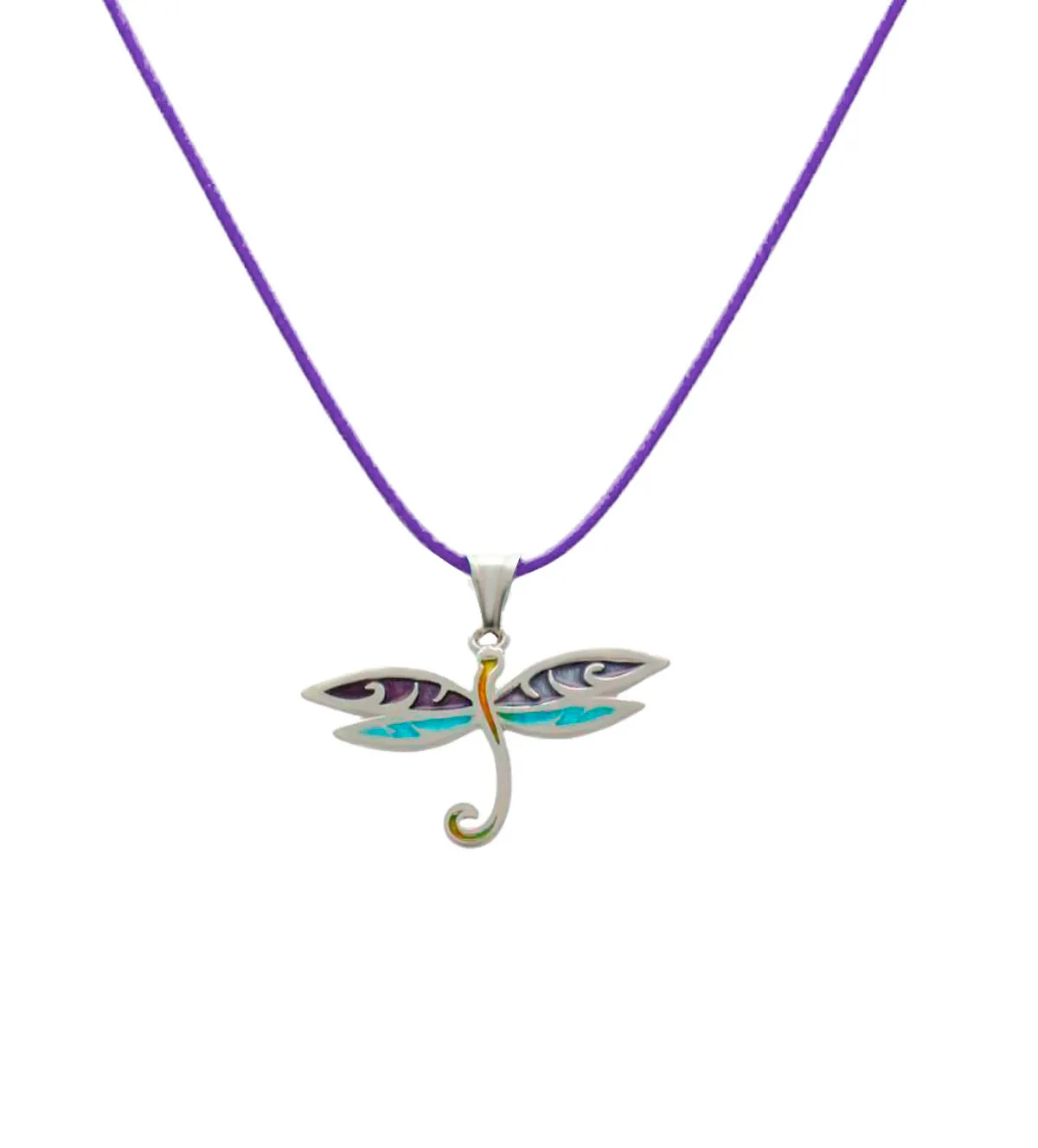 Esta joya destaca por su diseño contemporáneo y artístico. El centro de atención es la libélula, trabajada con esmalte a fuego, una técnica tradicional que aporta color, profundidad y resistencia al motivo decorativo. El contraste entre el tono púrpura del cordón y los brillos metálicos de la plata crea un juego visual armonioso y elegante, que añade dinamismo a cualquier look. Su estilo bohemio y moderno la convierte en un complemento ideal tanto para el día a día como para ocasiones especiales.