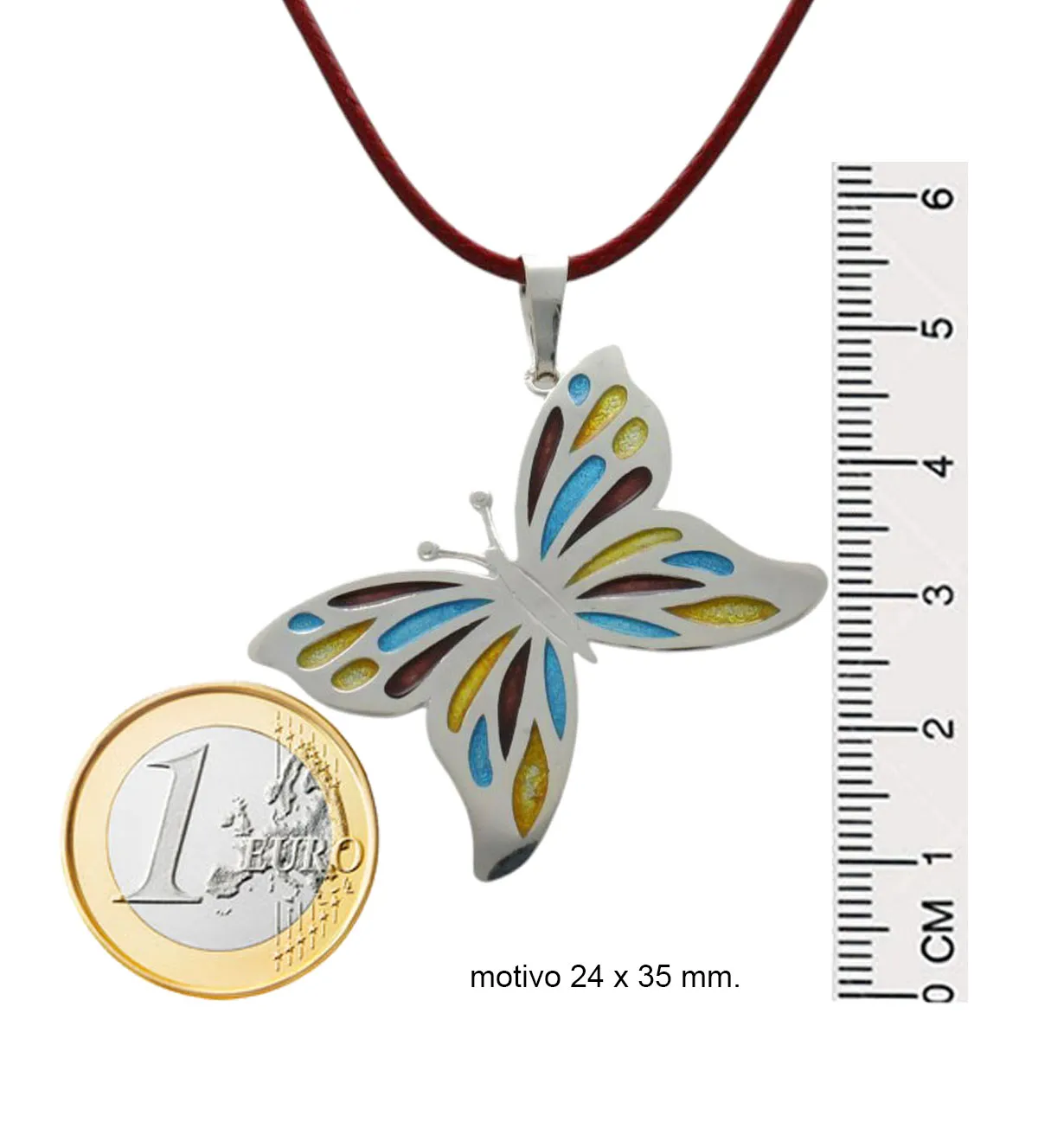Además del cierre de plata y la mariposa esmaltada, esta gargantilla se distingue por su ligereza, ideal para quienes prefieren joyas discretas pero con personalidad. El contraste cromático y la textura del cordel elevan su valor estético, haciéndola perfecta para cualquier edad.