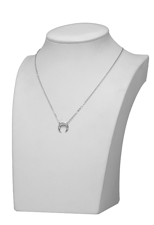 Bonito modelo de gargantilla realizada con plata de ley (925 milésimas) un motivo en forma de luna cuajada de circonitas colgando de una cadena fina de eslabones forzados con un cierre especial de reasa, es un modelo muy actual puesto de moda que aunque se ha representado cientos de veces tiene la singularidad de la forma con que se hace la media luna más cerrada y mirando hacia abajo, esta peculiar forma es la que la diferencia de los modelos más convencionales de media luna, pero sigue simbolizando la femineidad y la maternidad como siempre ha hecho.