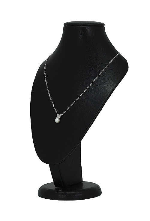 Bonita gargantilla que muestra una mariposa sobre una perla cultivada, colgando de una cadena de plata con eslabones tipo rolo de 40 centímetros de largo, el motivo tiene un tamaño de 5 x 7 milímetros y el peso total es de 2.00 gramos.