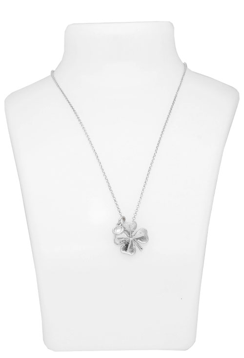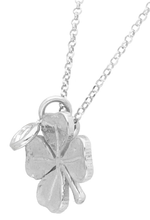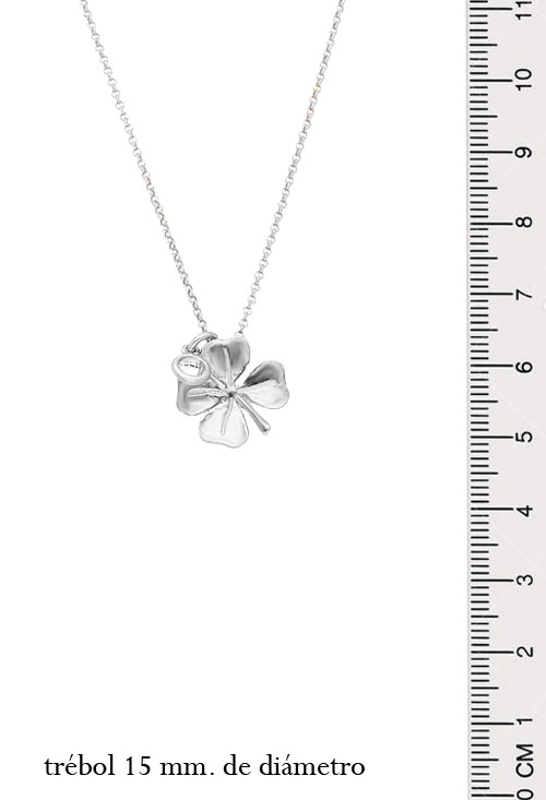 Gargantilla de plata motivo trébol, el motivo de esta gargantilla reune dos colgantes diferentes, una circonita engastada en boquilla y un trébol de cuatro hojas ambos penden de una cadena fina de eslabones tipo rolo con cierre de reasa, el trébol es uno de los amuletos más potentes para atraer la fortuna y buena suerte.