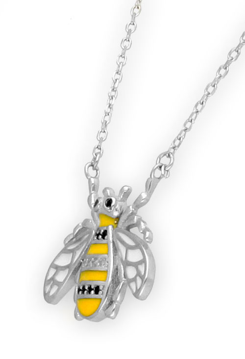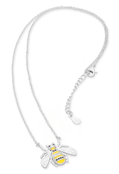 Gargantilla de plata de ley con motivo de abeja en silueta con esmalte en color amarillo para el cuerpo y blanco para las alas acompañado por 3 filas de circonitas en colores transparente y negro. Este colgante esta sujeto a una cadena de eslabones forzados que terminan en un cierre tipo mosquetón con longitud adaptable.
