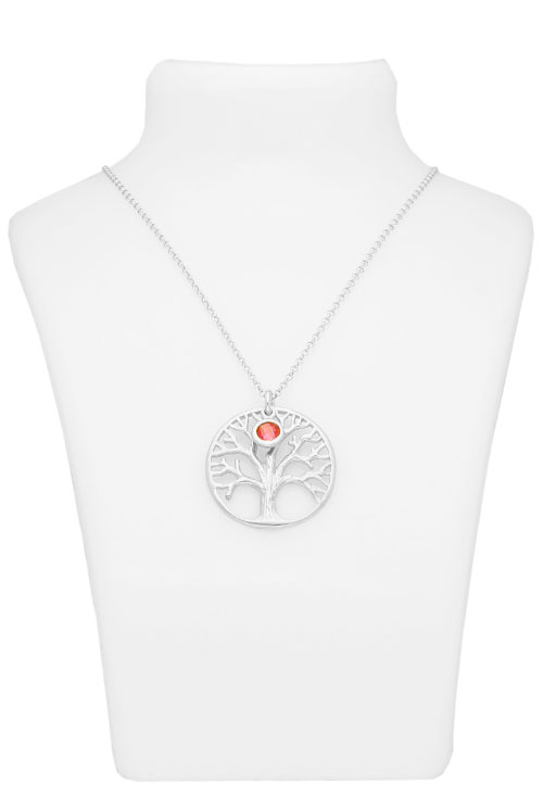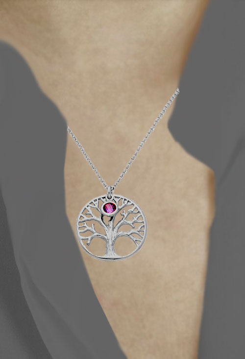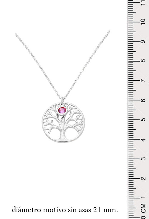 Gargantilla de plata motivo circular con árbol de la vida calado y una piedra de tono rosado, tanto el árbol como la piedra tienen significado propio, el árbol representa la union de lo terrenal con lo espiritual y el color rosa expresa femeneidad, cariño y amor, generosidad y amabilidad.