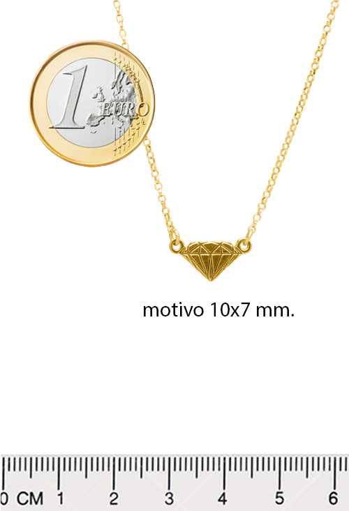 Gargantilla plata chapada. Cadena fina de eslabones con motivo colgando en forma de piedra preciosa talla brillante, gargantilla para mujer, colgante con silueta de diamante, cadena de eslabones rolo, ambos en plata de ley chapada en color oro amarillo.figura diamante: 10×7 milímetros, largo: 40 centímetros, peso aproximado: 1,40 gramos. GR. Gargantillas de plata a juego con los pendientes ref: 012752-2-1 y la pulsera ref 042752-2-1, disponible venta online.