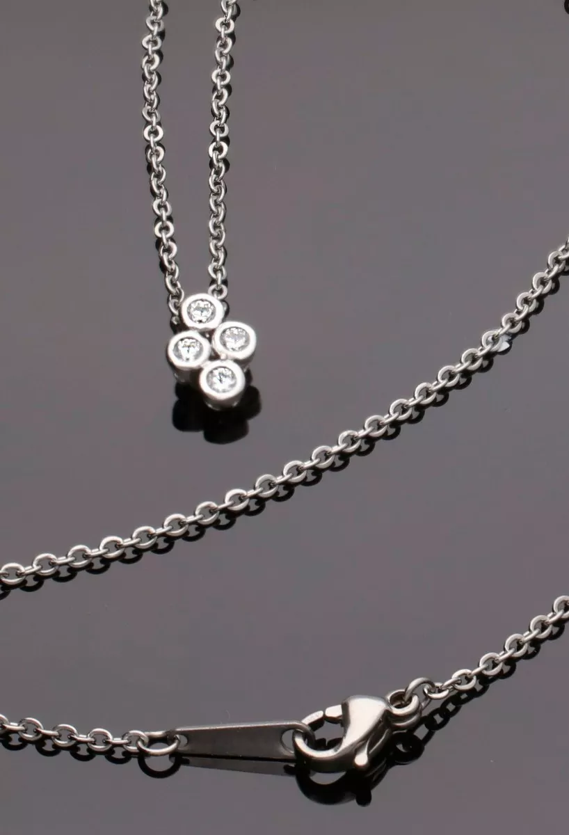 Gargantilla plata y acero motivo trebol con cuatro circonitas, sencillo modelo muy elegante para que puedas lucir en toda tu plenitud cada vez que lo luzcas resplandeciendo por tu fineza y buen gusto, la cadena aguantara todala vida al ser de acero quirurgico y el motivo esta realizado en plata de ley ambos componentes con termancion en rodio oro blanco, las circonitas son de la mejor calidad.