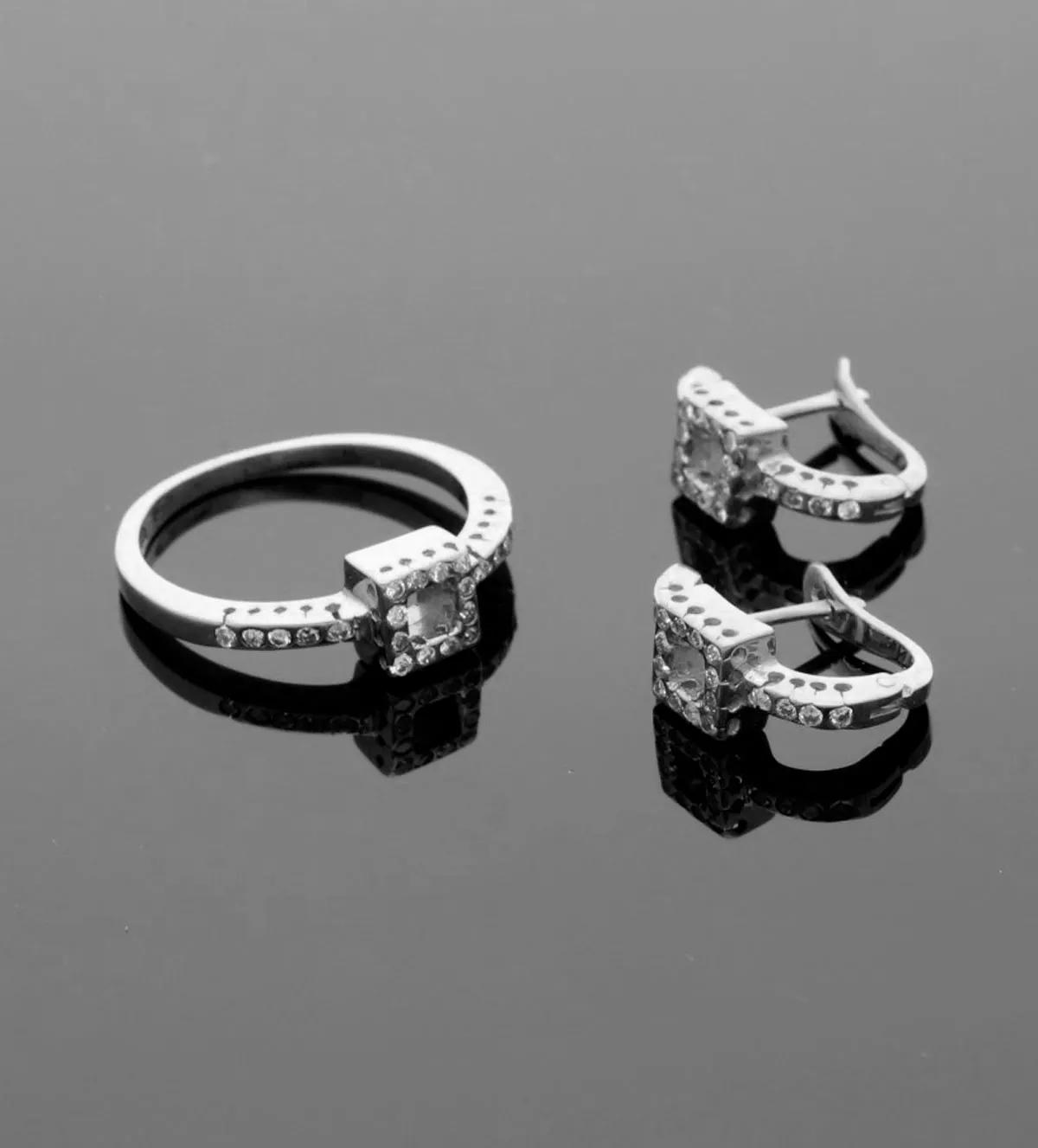 Descubre la elegancia atemporal de nuestro Conjunto en Oro Blanco con Diamantes Tallados en Brillante, un diseño original que encarna la promesa de un amor eterno. Este conjunto excepcional presenta una galera de diamantes de forma cuadrada como motivo central, de la cual se extiende otra galería rectilínea, ambas engastadas en garra para resaltar su brillo único. Creado para momentos inolvidables, este juego es una obra maestra que fusiona la artesanía experta con la belleza eterna de los diamantes.