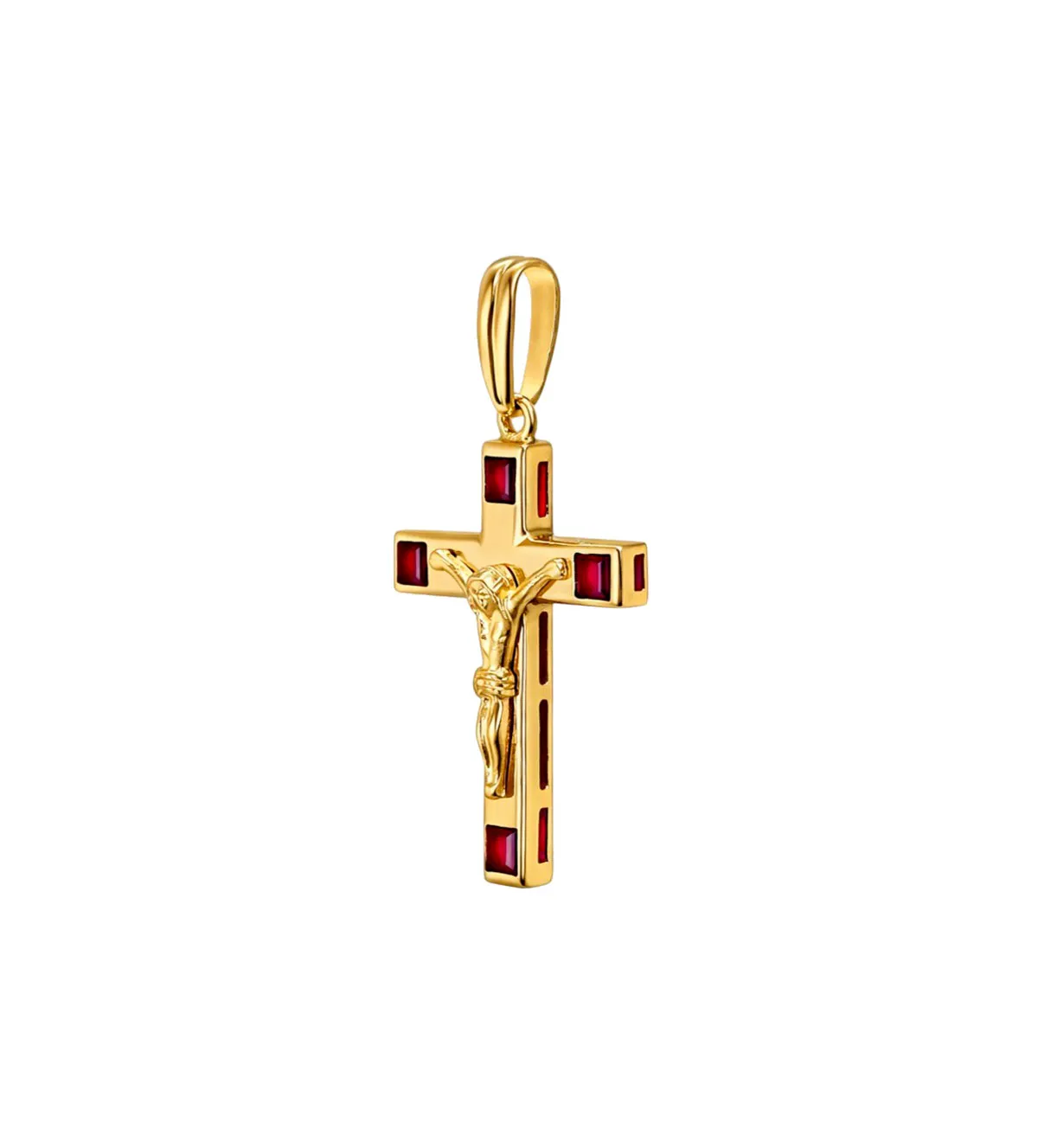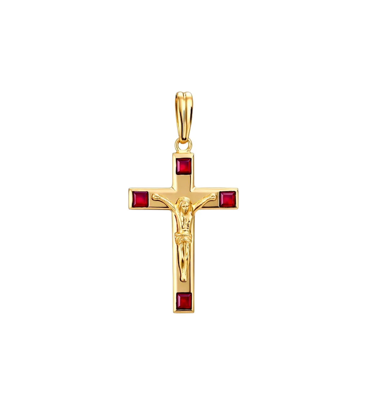 Cruz de oro que cautiva a primera vista por su elegancia y fuerza simbólica. Elaborada en oro de 18 quilates y realzada con cuatro rubíes talla carré de máxima calidad, ofrece un brillo intenso y un diseño distinguido que realza cualquier look. Su acabado en brillo y su presencia sofisticada la convierten en una pieza única y exclusiva. Disponible para entrega inmediata. Hazla tuya ahora y disfruta de la excelencia y calidad que solo una joya excepcional puede ofrecer.