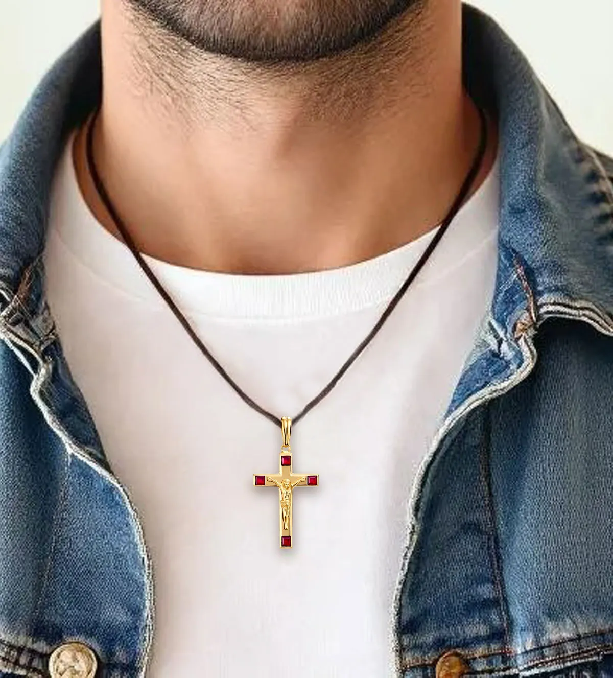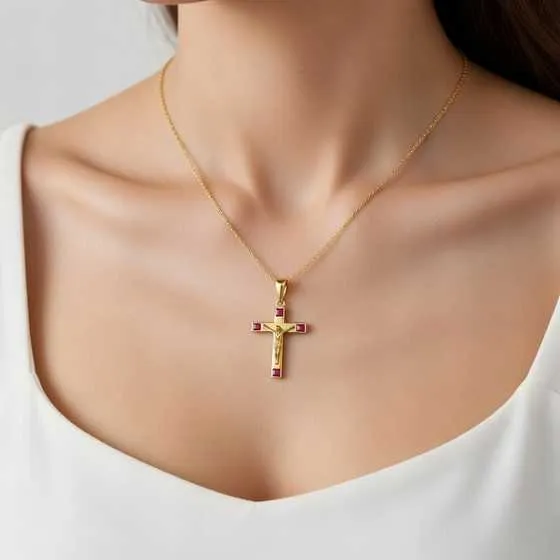 Me encanta cómo brillan esos rubíes en la cruz, le dan un toque elegante sin pasarse. El oro amarillo queda perfecto y es ligera para llevarla puesta todo el día. Justo lo que necesitaba.