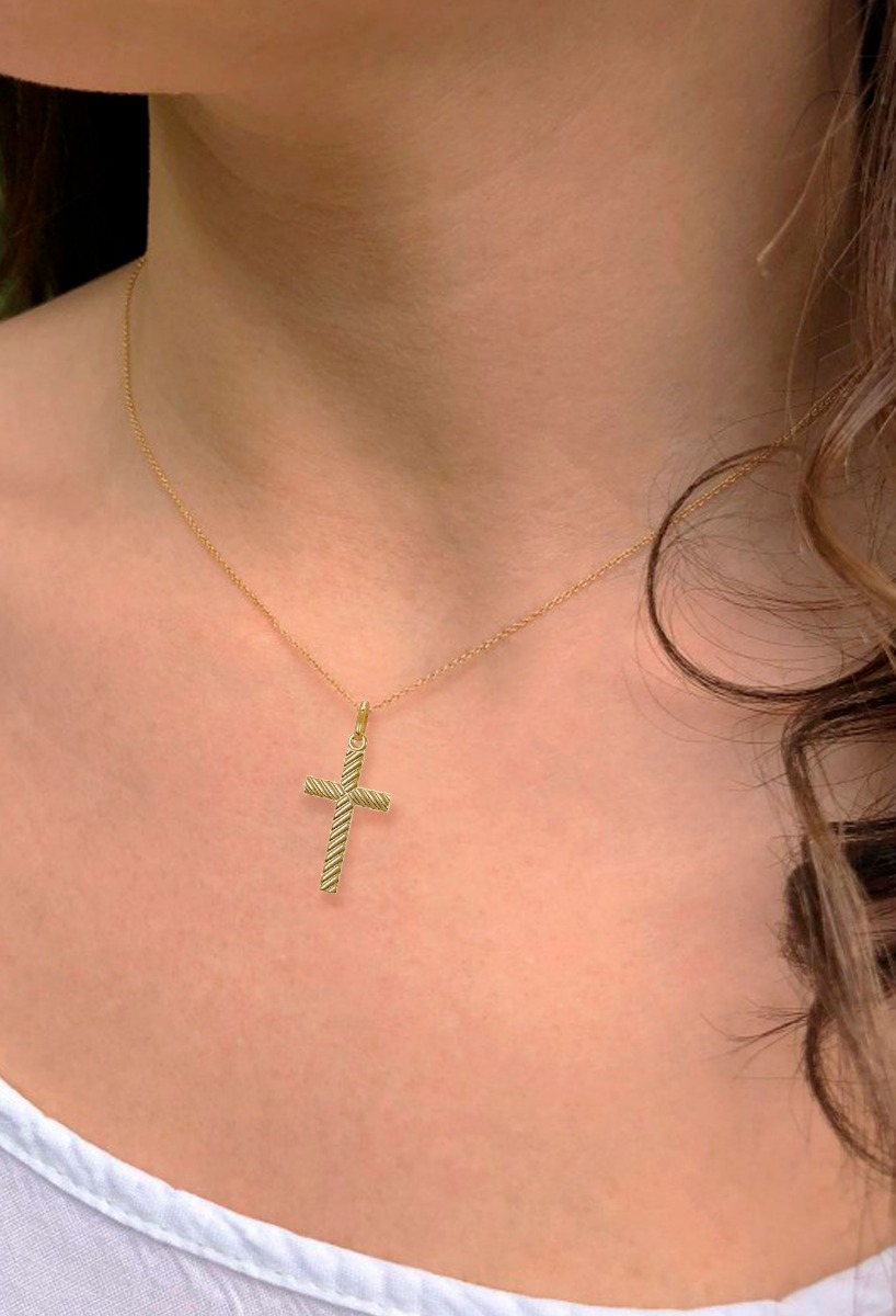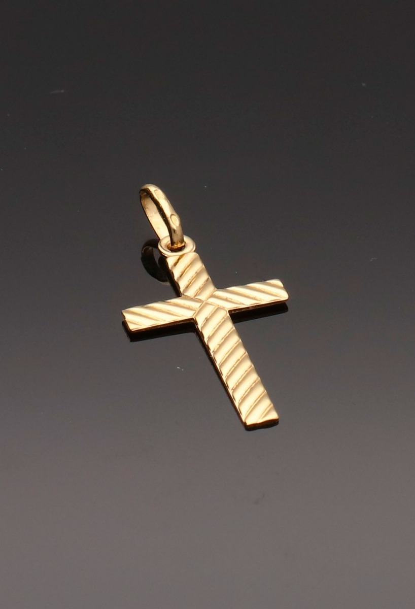 Cruz de oro amarillo 9 kilates (375 milesimas) chapa plana con gallones diagonales, bonito modelo que permite poder ser grabada por su parte posterior, precioso regalo que el que lo reciba lo conservara a lo largo de toda su vida, es la cruz un símbolo catolico internacionalmente conocido, en su nombre se han librado guerras y se han construido imperios pero lo más importante de la cruz es su simbologia siendo el símbolo de protección más usado por toda la cristiandad.