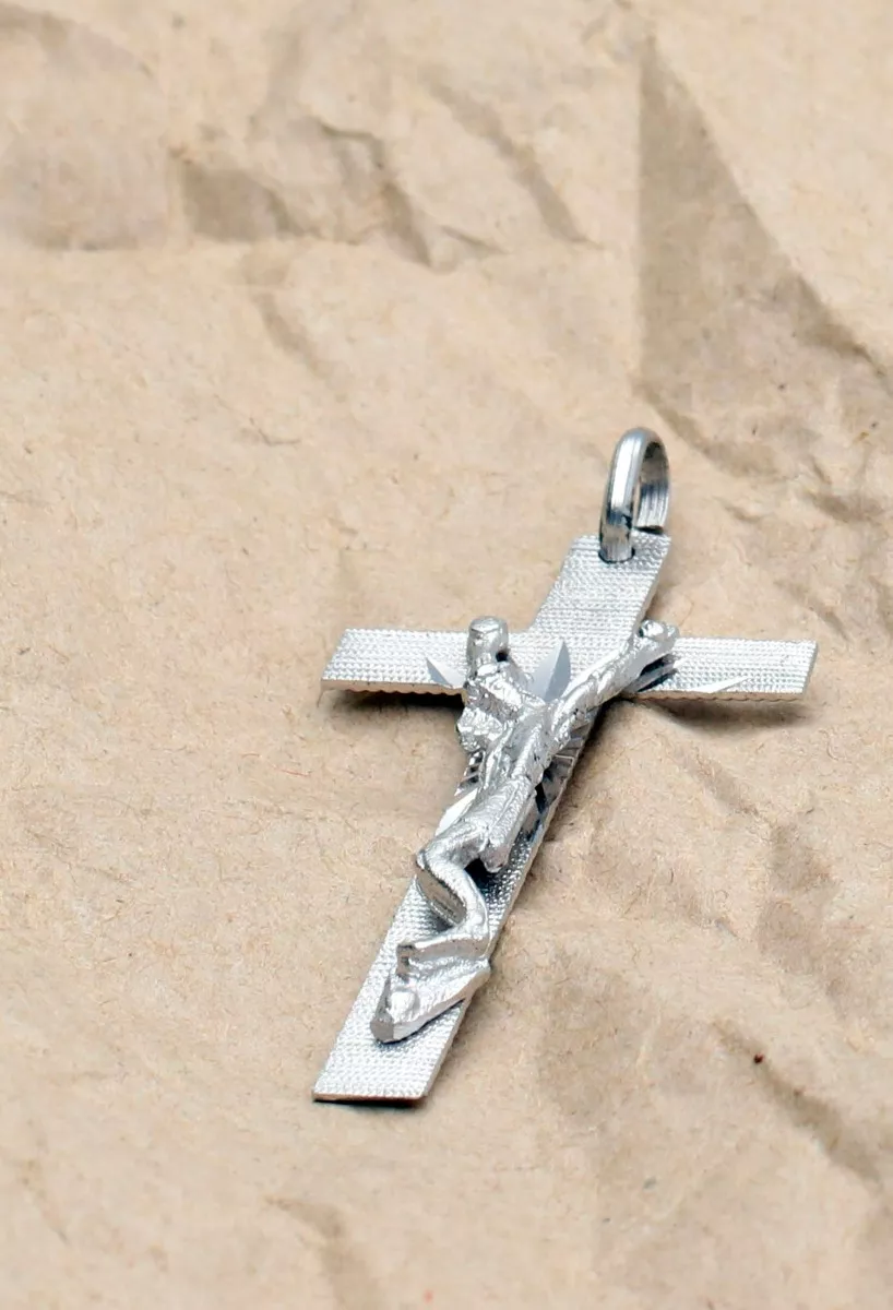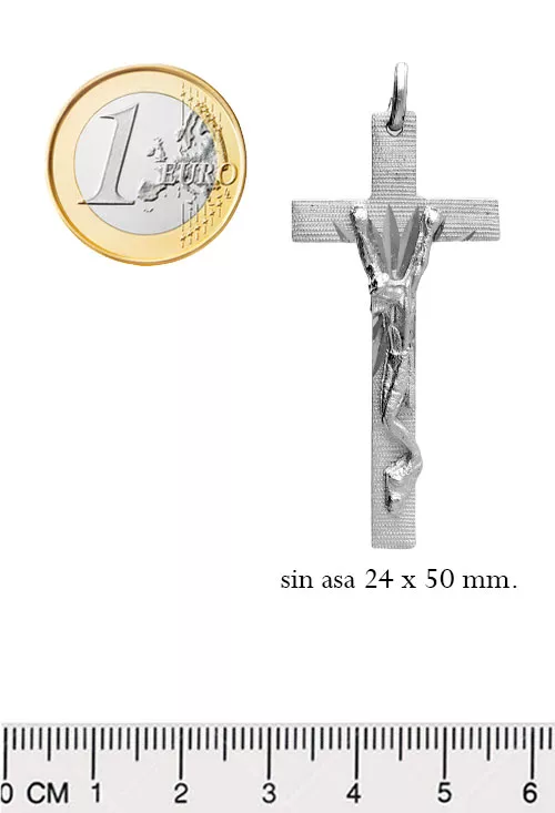 Cruz plata ley, original modelo de cruz con Cristo en relieve sobre base de brazos planos en acabado lapidado, es una cruz de tamaño grande perfecta para hacer un regalo a una religiosa o persona beata que sea muy religiosa, seguro que el regalo se convertirá en un gran acierto, lleva un asa de hilo redondo con un tamaño que permitirá poder colgarla de casi cualquier grueso de cadena.