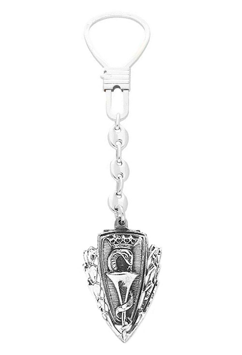 Llavero plata carrera de Farmacia, un llavero perfecto para hacer el regalo de la graduación, por supuesto para regalar a cualquier profesional de esta profesión con cualquier tipo de motivo, esta formado por una insignia triangular rodeada de laureles con el logo de la carrera realizado en alto relieve que cuelga de una cadena de calabrote y una lira de alta seguridad.